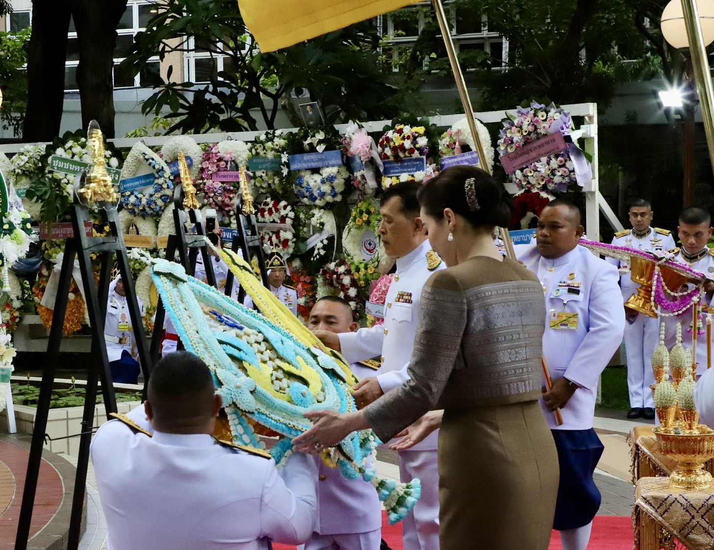 สมเด็จพระนางเจ้า ฯ พระบรมราชินี ทรงวางพุ่มดอกไม้ของสมเด็จพระนางเจ้าสิริกิติ์ พระบรมราชินีนาถ พระบรมราชชนนีพันปีหลวง และพุ่มดอกไม้ส่วนพระองค์ ทรงวางพวงมาลัย ทรงจุดธูปเทียนเครื่องทองน้อยถวายราชสักการะ ทรงกราบ