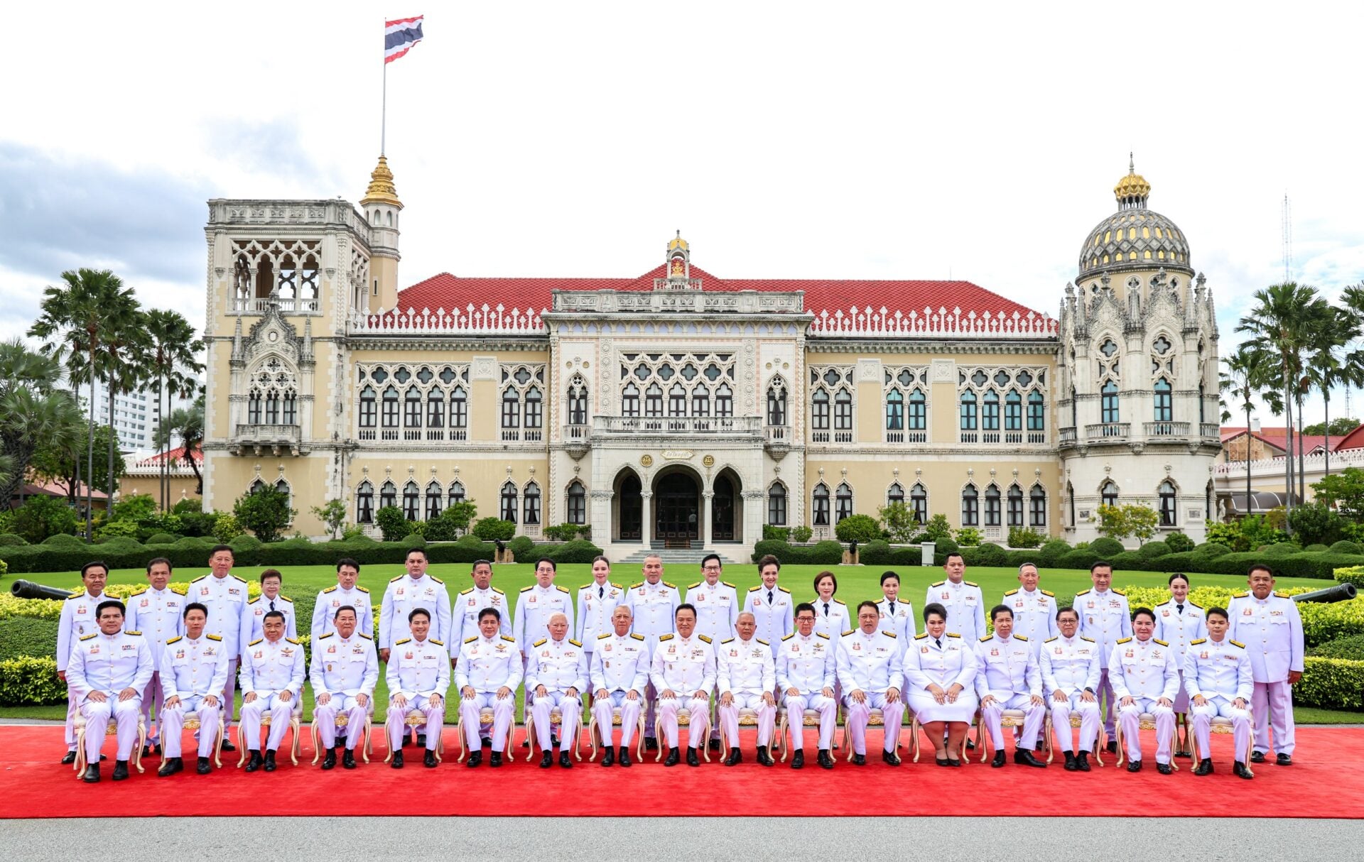 นั่งจากซ้าย: สุรศักดิ์ พันธ์เจริญวรกุล รัฐมนตรีว่าการกระทรวงการอุดมศึกษา วิทยาศาสตร์ วิจัยและนวัตกรรม, อรรถกร ศิริลัทธยากร รัฐมนตรีว่าการกระทรวงท่องเที่ยวและกีฬา, ณัฐพล นาคพาณิชย์ รัฐมนตรีว่าการกระทรวงกลาโหม, นภินทร ศรีสรรพางค์ รัฐมนตรีประจำสำนักนายกรัฐมนตรี, ภราดร ปริศนานันทกุล รัฐมนตรีประจำสำนักนายกรัฐมนตรี