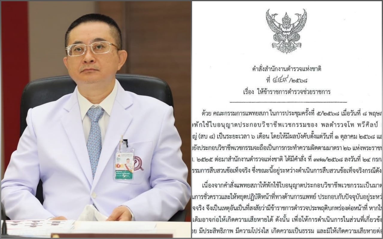 2 ต.ค.2568-พล.ต.อ.กิตติ์รัฐ พันธุ์เพ็ชร์ ผู้บัญชาการตำรวจแห่งชาติ(ผบ.ตร.) มีหนังสือคำสั่งสำนักงานตำรวจแห่งชาติ เรื่อง ให้ข้าราชการตำรวจช่วยราชการ เนื้อหาระบุว่า ด้วย คณะกรรมการแพทยสภา ในการประชุมครั้งที่ 5/2568 เมื่อวันที่ 8 พฤษภาคม 2568 มีมติลงโทษพักใช้ใบอนุญาตประกอบวิชาชีพเวชกรรมของ พลตำรวจโท ทวีศิลป์ เวชวิทารณ์ นายแพทย์ใหญ่ (สบ8) เป็นระยะเวลา 6 เดือน โดยให้มีผลบังคับตั้งแต่วันที่ 1 ตุลาคม 2568 และหากกระทำการฝ่าฝืนโดยยังประกอบวิชาชีพเวชกรรมจะถือเป็นการกระทำความผิดตามมาตรา 26 แห่งพระราชบัญญัติวิชาชีพเวชกรรม พ.ศ.2525 ต่อมาสำนักงานตำรวจแห่งชาติ ได้มีคำสั่ง ที่ 371/2568 ลงวันที่ 24 กรกฎาคม 2568 แต่งตั้งคณะกรรมการสืบสวนข้อเท็จจริง ซึ่งขณะนี้อยู่ระหว่างดำเนินการสืบสวนข้อเท็จจริงกรณีดังกล่าว