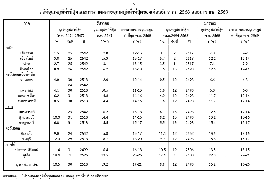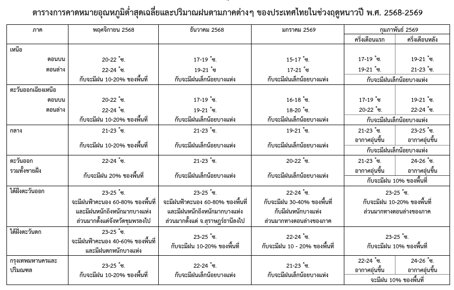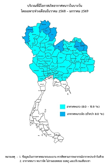 ช่วงเวลาที่มีอากาศหนาวเย็นที่สุด ประมาณกลางเดือนธันวาคม 2568 ถึงต้นเดือนกุมภาพันธ์2569