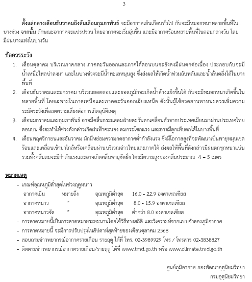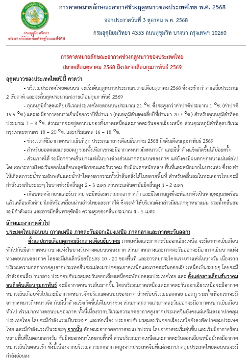 9 ตุลาคม 2568 - กรมอุตุนิยมวิทยา เผยแพร่ประกาศการคาดหมายลักษณะอากาศช่วงฤดูหนาวของประเทศไทยปีนี้ คาดว่า บริเวณประเทศไทยตอนบน จะเริ่มต้นฤดูหนาวประมาณปลายเดือนตุลาคม 2568 ซึ่งจะช้ากว่าค่าเฉลี่ยประมาณ 2 สัปดาห์และจะสิ้นสุดประมาณปลายเดือนกุมภาพันธ์ 2569