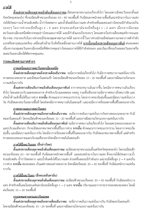 3. เดือนมกราคมและกุมภาพันธ์ อาจมีคลื่นกระแสลมฝ่ายตะวันตกเคลื่อนตัวจากประเทศเมียนมาผ่านประเทศไทยตอนบน ซึ่งจะทำให้ช่วงดังกล่าวเกิดฝนฟ้าคะนอง ลมกระโชกแรง และอาจมีลูกเห็บตกได้ในบางพื้นที่