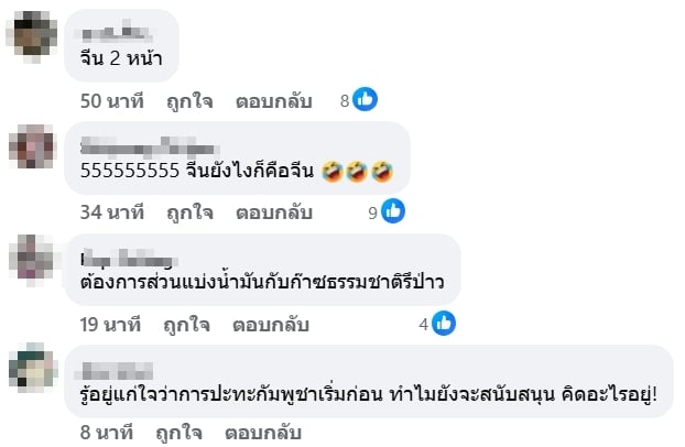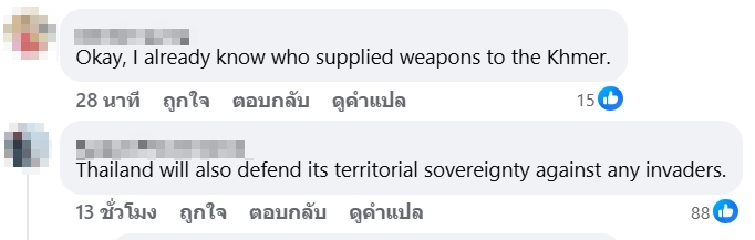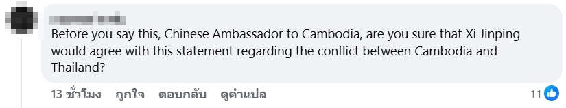 ทั้งนี้ได้มีผู้ใช้เฟซบุ๊กที่อยู่ในประเทศไทย เข้ามาคอมเมนต์เป็นภาษาอังกฤษและภาษาไทยมีข้อความว่า โอเค ฉันรู้แล้วว่าใครเป็นผู้จัดหาอาวุธให้กับชาวเขมร , ประเทศไทยจะปกป้องอธิปไตยเหนือดินแดนของตนเองจากผู้รุกรานด้วย , ก่อนที่คุณจะพูดสิ่งนี้ เอกอัครราชทูตจีนประจำกัมพูชา คุณแน่ใจหรือไม่ว่า สีจิ้นผิง จะเห็นด้วยกับคำกล่าวเกี่ยวกับความขัดแย้งระหว่างกัมพูชาและไทยนี้? , จีนสองหน้า , 555 จีนยังไงก็คือจีน , ต้องการส่วนแบ่งน้ำมันกับก๊าซธรรมชาติรึป่าว , รู้อยู่แก่ใจว่าการปะทะกัมพูชาเริ่มก่อน ทำไมยังจะสนับสนุน คิดอะไรอยู่!