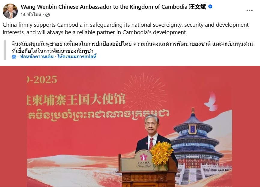 9 ตุลาคม 2568 - หวัง เหวินปิน เอกอัครราชทูตจีนประจำกัมพูชา โพสต์เฟซบุ๊กส่วนตัว Wang Wenbin Chinese Ambassador to the Kingdom of Cambodia 汪文斌 เป็นข้อความสั้นๆว่า จีนสนับสนุนกัมพูชาอย่างมั่นคงในการปกป้องอธิปไตย ความมั่นคงและการพัฒนาของชาติ และจะเป็นหุ้นส่วนที่เชื่อถือได้ในการพัฒนาของกัมพูชา