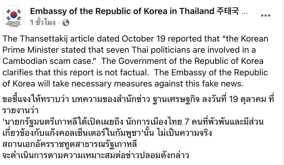 19 ต.ค. 2568 – สถานเอกอัครราชทูตสาธารณรัฐเกาหลีประจำประเทศไทย โพสต์ข้อความระบุว่า ขอชี้แจงให้ทราบว่า บทความของสื่อที่รายงานว่า ‘นายกรัฐมนตรีเกาหลีใต้เปิดเผยถึง นักการเมืองไทย 7 คนที่พัวพันและมีส่วนเกี่ยวข้องกับแก๊งคอลเซ็นเตอร์ในกัมพูชา’นั้น ไม่เป็นความจริง