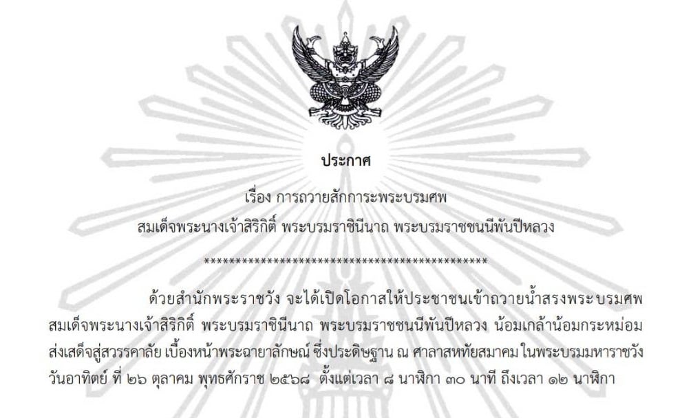 26 ต.ค. 2568 – เมื่อวันที่ 25 ต.ค.2568 สำนักพระราชวังเผยแพร่ประกาศเรื่อง การถวายสักการะพระบรมศพสมเด็จพระนางเจ้าสิริกิติ์ พระบรมราชินีนาถ พระบรมราชชนนีพันปีหลวง ความว่า ด้วยสำนักพระราชวังจะได้เปิดโอกาสให้ประชาชนเข้าถวายน้ำสรงพระบรมศพสมเด็จพระนางเจ้าสิริกิติ์ พระบรมราชินีนาถ พระบรมราชชนนีทันปีหลวง น้อมเกล้าน้อมกระหม่อมส่งเสด็จสู่สวรรคาลัย เบื้องหน้าพระฉายาลักษณ์ ซึ่งประดิษฐาน ณ ศาลาสหทัยสมาคมในพระบรมมหาราชวัง วันอาทิตย์ ที่ 26 ตุลาคม พุทธศักราช 2568 ตั้งแต่เวลา 8 นาฬิกา 30 นาที ถึงเวลา 12 นาฬิกา
