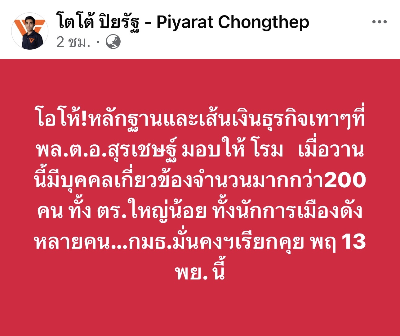 โดยนายปิยรัฐ ระบุว่า “โอ้โห หลักฐานและเส้นเงินธุรกิจเทาๆที่ พล.ต.อ.สุรเชษฐ์ มอบให้ นายรังสิมันต์ โรม เมื่อวานนี้ มีบุคคลเกี่ยวข้องจำนวนมากกว่า 200 คน ทั้ง ตำรวจใหญ่น้อย ทั้งนักการเมืองดังหลายคน กมธ.มั่นคงฯ เรียกคุย วันพฤหัสบดีที่ 13 พ.ย. นี้”