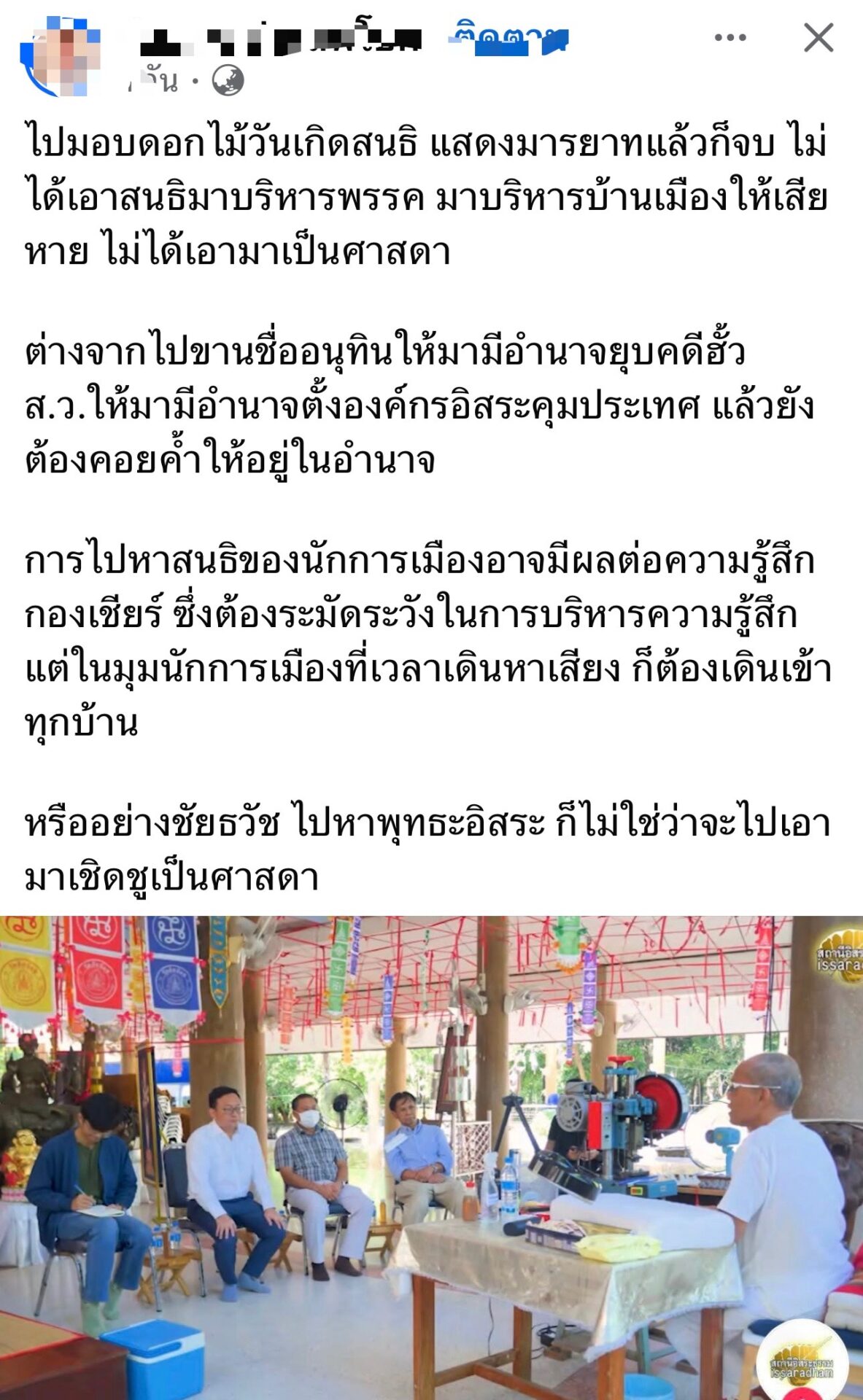 โดยภาพประกอบที่แนบมาด้วยเป็นภาพช่วงที่นายชัยธวัชและคณะเข้าพบหลวงปู่พุทธะอิสระ ซึ่งถูกนำมาเผยแพร่ในโลกออนไลน์อีกครั้ง เพื่อเปรียบเทียบมารยาททางการเมืองของทั้งสองฝ่าย.