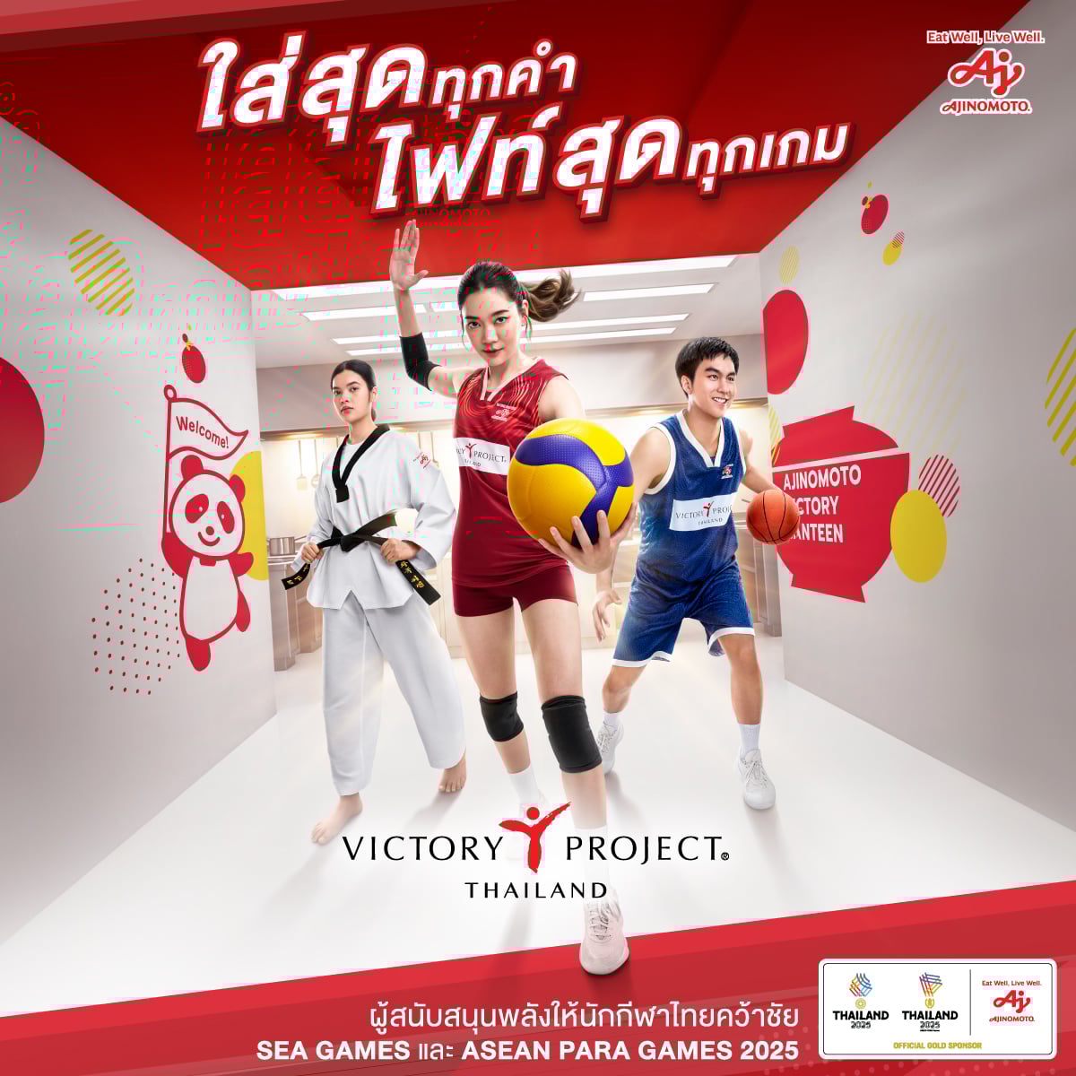 โครงการ Thailand Victory Project โดยอายิโนะโมะโต๊ะ ร่วมดูแลและสนับสนุนนักกีฬาไทยให้พร้อมที่สุด ด้วย “มื้ออาหารแห่งชัยชนะ (Winning Meals)” ที่คิดค้นด้วยความเชี่ยวชาญด้าน AminoScience อร่อย มีคุณค่าทางโภชนาการ และสอดคล้องกับเป้าหมายของนักกีฬา ตั้งแต่วันแรกที่เริ่มซ้อม จนถึงวันชิงชัยบนสนามแข่ง