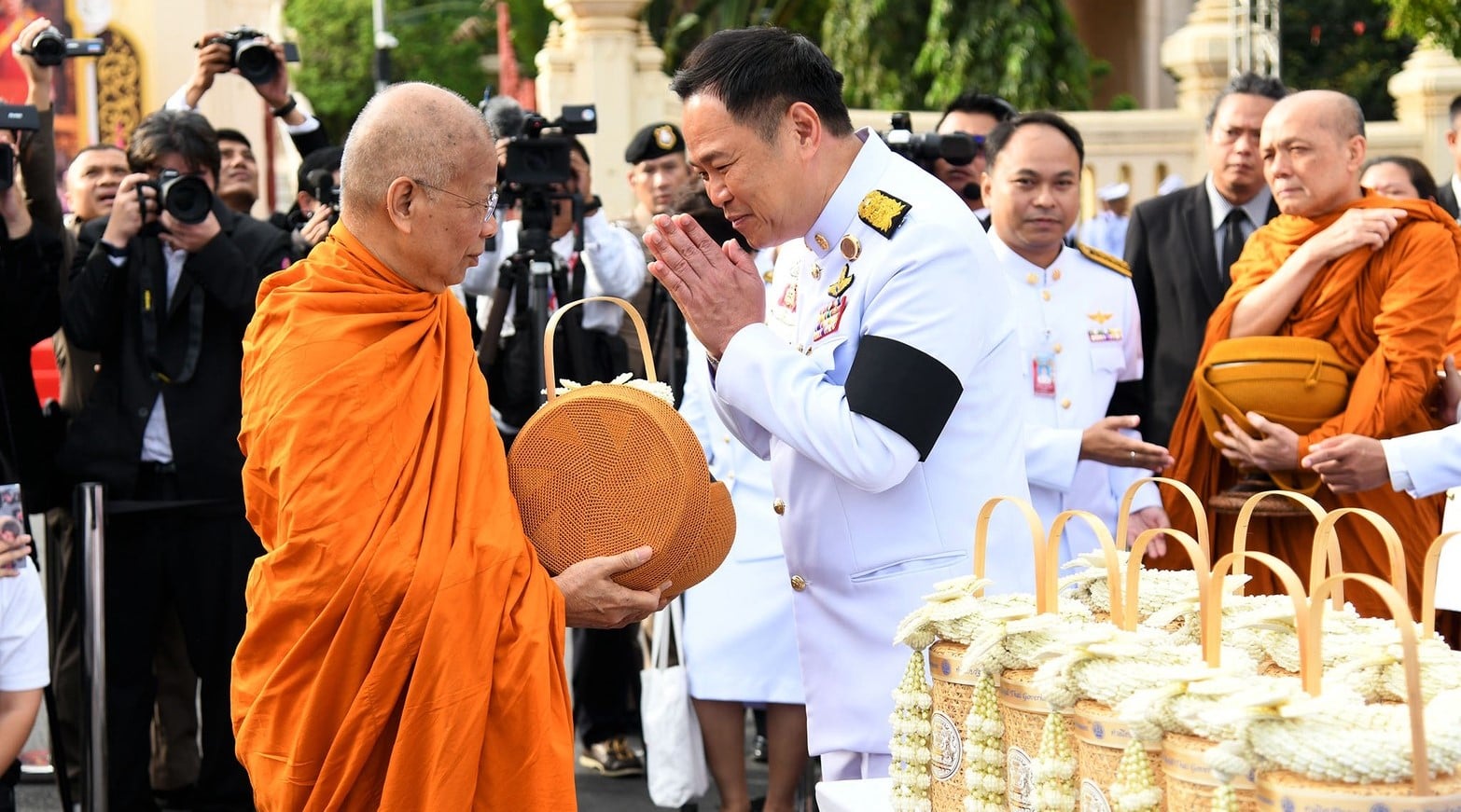 จากนั้น นายกรัฐมนตรี ประธานวุฒิสภา (ผู้แทนประธานรัฐสภา) ผู้แทนประธานศาลฎีกา ถวายเครื่องไทยธรรมและถวายผ้าไตรแด่พระสงฆ์ พระสงฆ์สดับปกรณ์ อนุโมทนา ถวายอดิเรก นายกรัฐมนตรีกรวดน้ำ และกราบลาพระรัตนตรัย ถวายความเคารพพระบรมฉายาลักษณ์พระบาทสมเด็จพระมงกุฎเกล้าเจ้าอยู่หัว และพระรูปสมเด็จพระเจ้าภคินีเธอ เจ้าฟ้าเพชรรัตนราชสุดา สิริโสภาพัณณวดี ก่อนจะนำผู้เข้าร่วมในพิธีร่วมตักบาตร โดยมีพระสงฆ์ จำนวน 100 รูป เดินออกรับบิณฑบาต