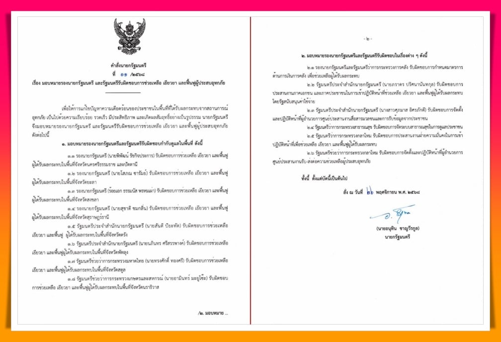 จึงมอบหมายรองนายกรัฐมนตรี และรัฐมนตรีรับผิดชอบการช่วยเหลือ เยียวยา และฟื้นฟูผู้ประสบอุทกภัยดังต่อไปนี้ ประกอบด้วย 1.มอบหมายรองนายกรัฐมนตรีและรัฐมนตรีรับผิดชอบกำกับดูแลในพื้นที่ ดังนี้ 1.นายพิพัฒน์ รัชกิจประการ รองนายกรัฐมนตรี รับผิดชอบการช่วยเหลือ เยียวยา และฟื้นฟูผู้ได้รับผลกระทบในพื้นที่จังหวัดนครศรีธรรมราช และปัตตานี 2.นายโสภณ ชารัมย์ รองนายกรัฐมนตรี รับผิดชอบการช่วยเหลือ เยียวยา และฟื้นฟู ผู้ได้รับผลกระทบในพื้นที่จังหวัดยะลา 3.ร.อ.ธรรมนัส พรหมเผ่า รองนายกรัฐมนตรี รับผิดชอบการช่วยเหลือ เยียวยา และฟื้นฟู ผู้ได้รับผลกระทบในพื้นที่จังหวัดสงขลา 4.นายสุชาติ ชมกลิ่น รองนายกรัฐมนตรี รับผิดชอบการช่วยเหลือ เยียวยา และฟื้นฟูผู้ได้รับผลกระทบในพื้นที่จังหวัดสุราษฎร์ธานี