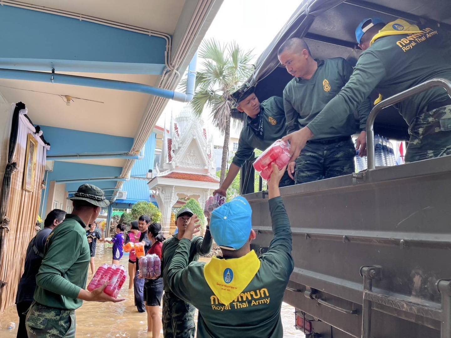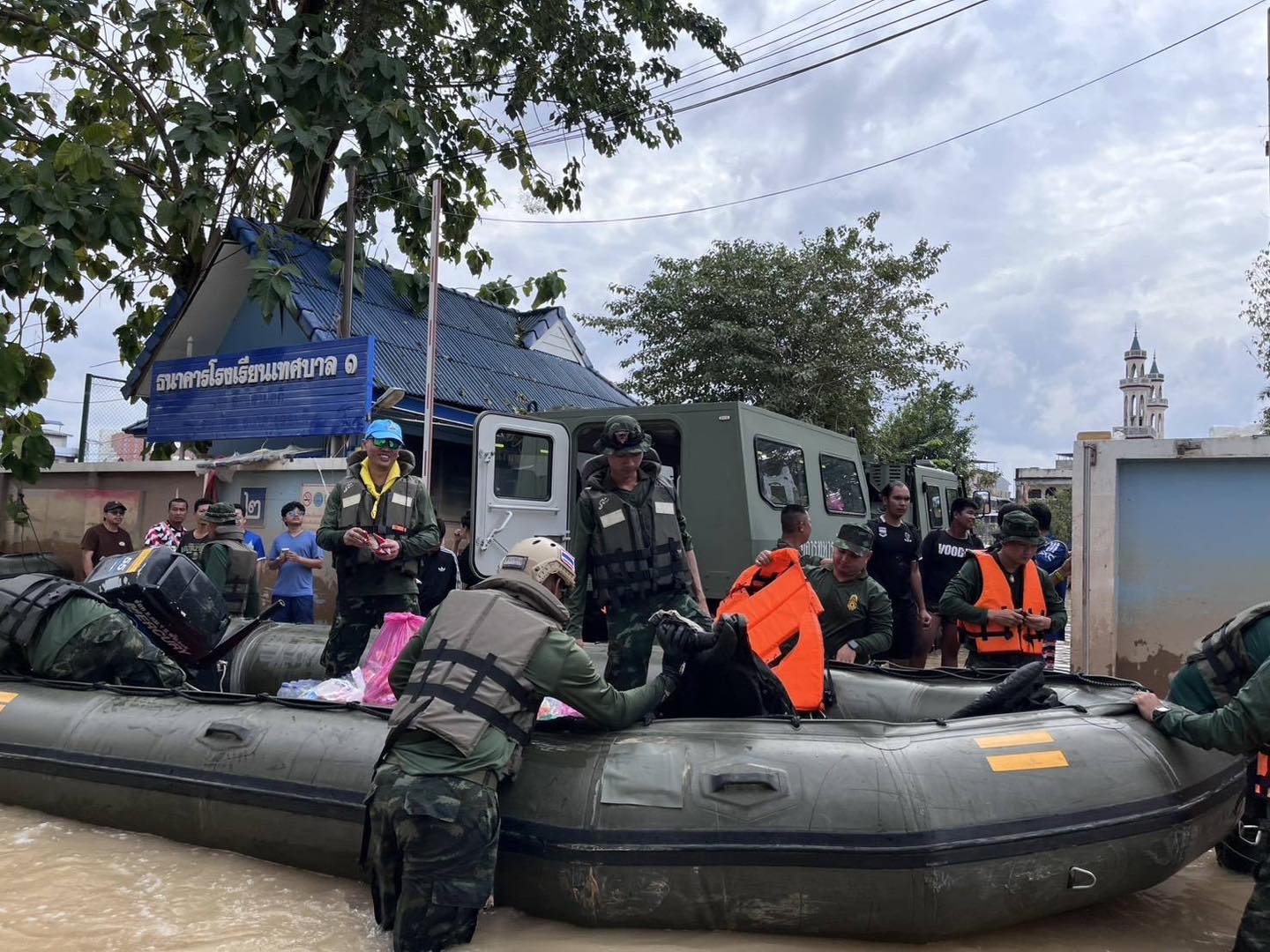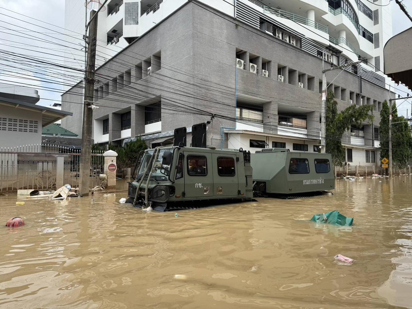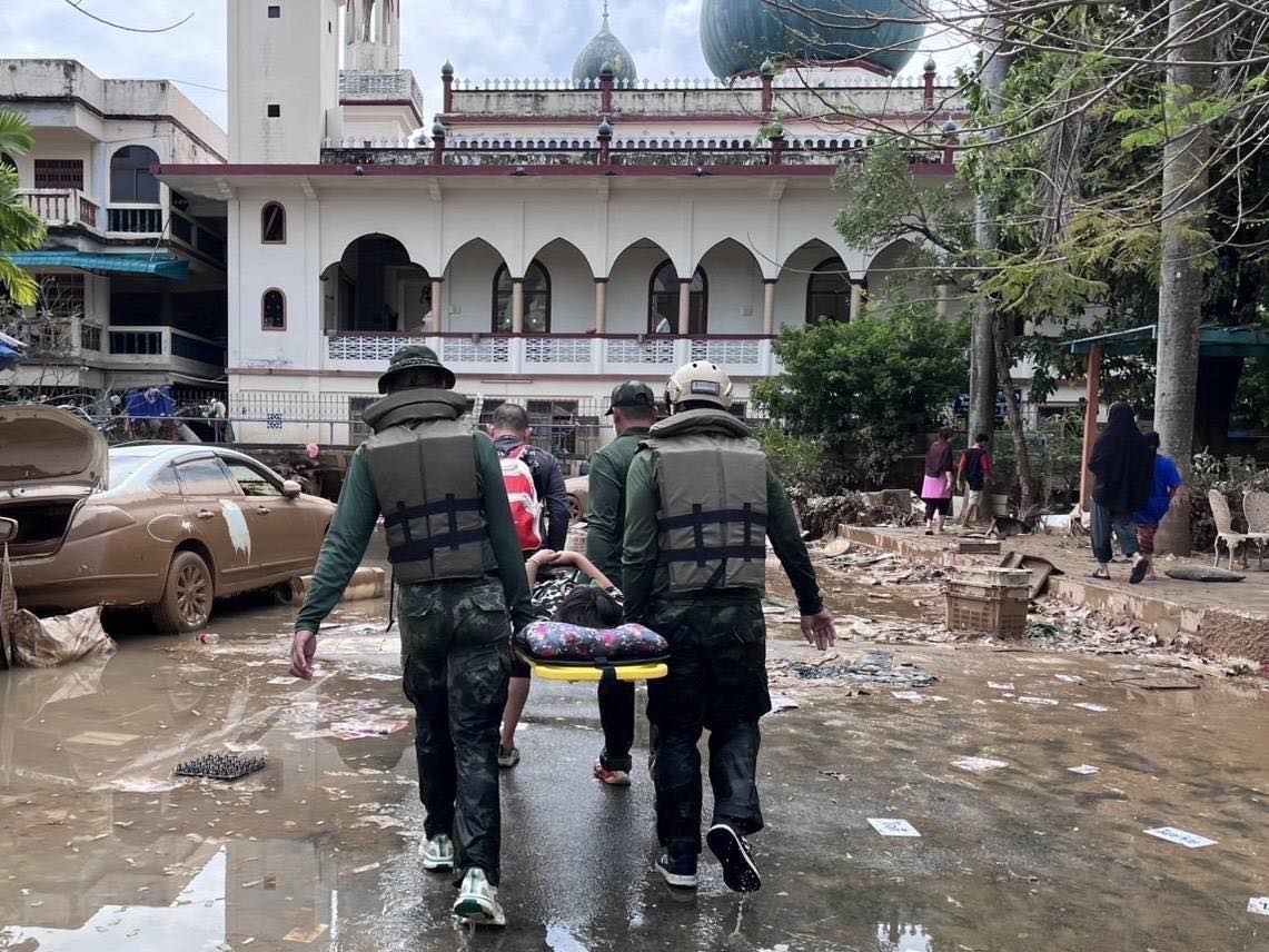 ก่อนหน้านั้น ทหารช่างโดยกรมการทหารช่างได้จัดรถสายพานเอนกประสงค์ (Extreme V) ซึ่งมีขีดความสามารถในการลุยน้ำลึกและเคลื่อนที่ผ่านสิ่งกีดขวางหรือวัตถุแหลมคมใต้น้ำ ลงพื้นที่ตลาดทัวร์รัถการ และชุมชนป้อม 6 ตำบลหาดใหญ่ อำเภอหาดใหญ่ จังหวัดสงขลา เพื่อนำอาหารและน้ำดื่มไปแจกจ่ายให้กับประชาชนที่ได้รับผลกระทบด้วย.