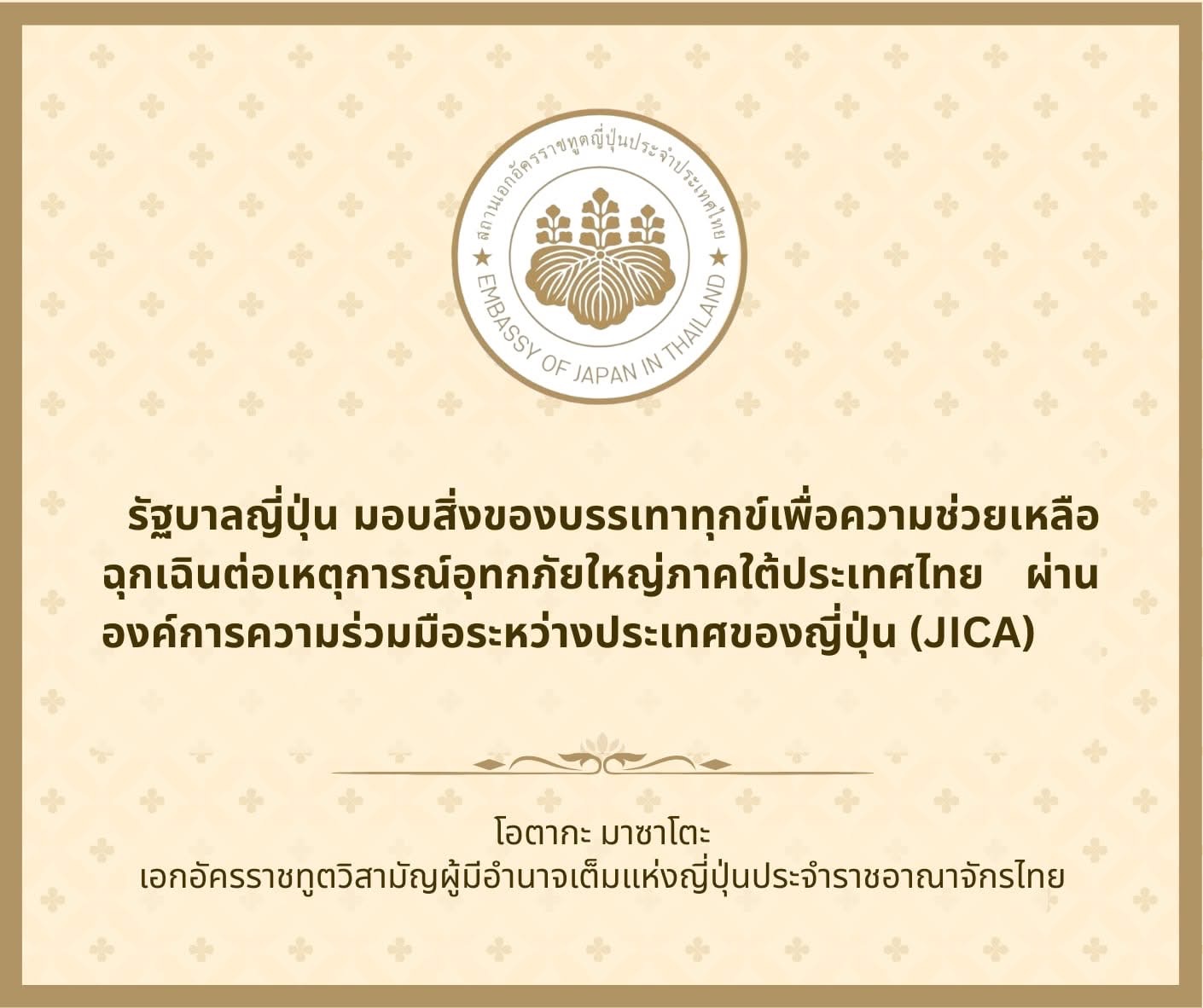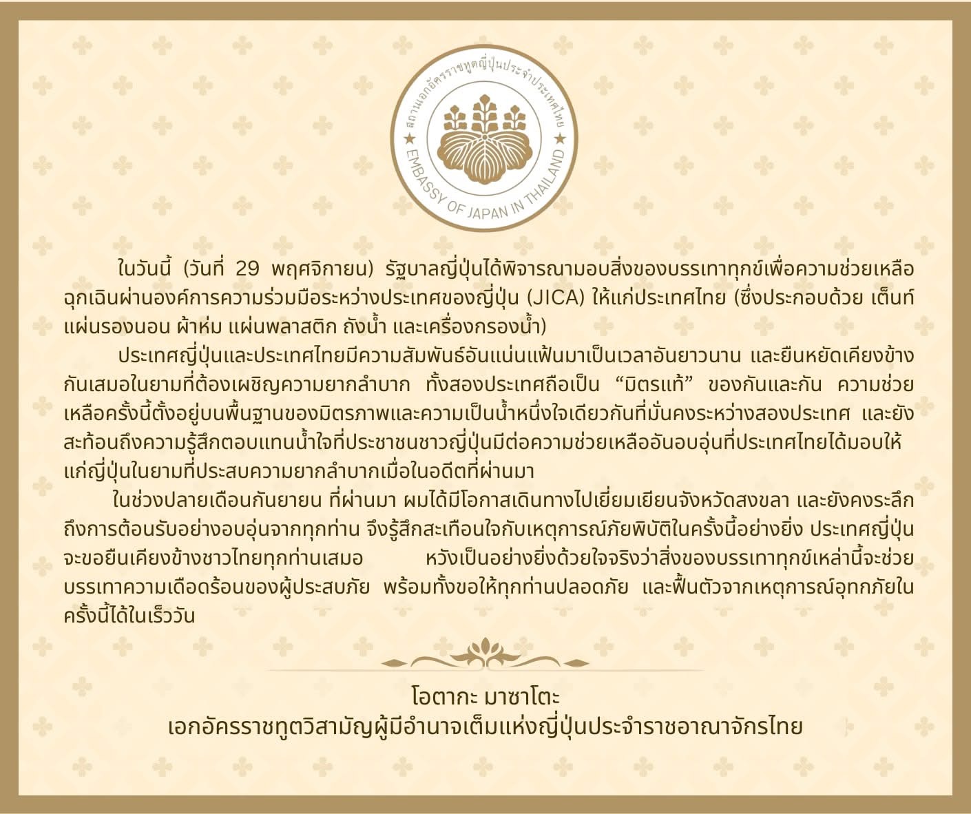 สถานทูตญี่ปุ่นฯ เผยรัฐบาลญี่ปุ่นจัดส่งเต็นท์-ผ้าห่ม-แผ่นรองนอน-ถังน้ำ-เครื่องกรองน้ำ ผ่าน JICA เพื่อช่วยไทยในภาวะน้ำท่วม สะท้อนมิตรภาพและความผูกพันที่ยืนยาว พร้อมสารจากเอกอัครราชทูตมาซาโตะ โอตากะ ที่กล่าวถึงความทรงจำอันอบอุ่นจากชาวสงขลา และหวังให้ไทยก้าวผ่านวิกฤตครั้งนี้ได้โดยเร็ว