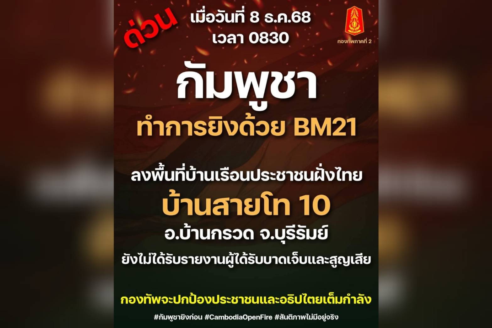 8 ธ.ค.2568-เพจกองทัพภาคที่ 2 โพสต์ข้อความระบุว่า ด่วน เมื่อวันที่ 8 ธ.ค.68 เวลา 08.30 น. กัมพูชาทำการยิงด้วย BM21 ลงพื้นที่บ้านเรือนประชาชนฝั่งไทย บ้านสายโท 10 อ.บ้านกรวด จ.บุรีรัมย์ ยังไม่ได้รับรายงานผู้ได้รับบาดเจ็บและสูญเสีย กองทัพจะปกป้องประชาชนและอธิปไตยเต็มกำลัง