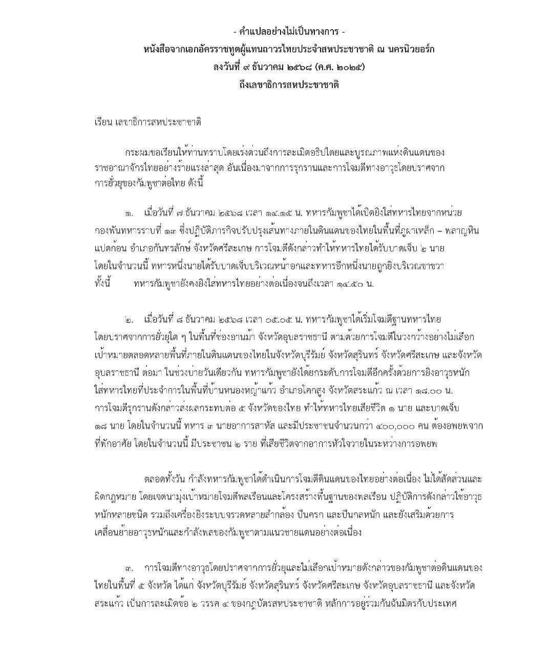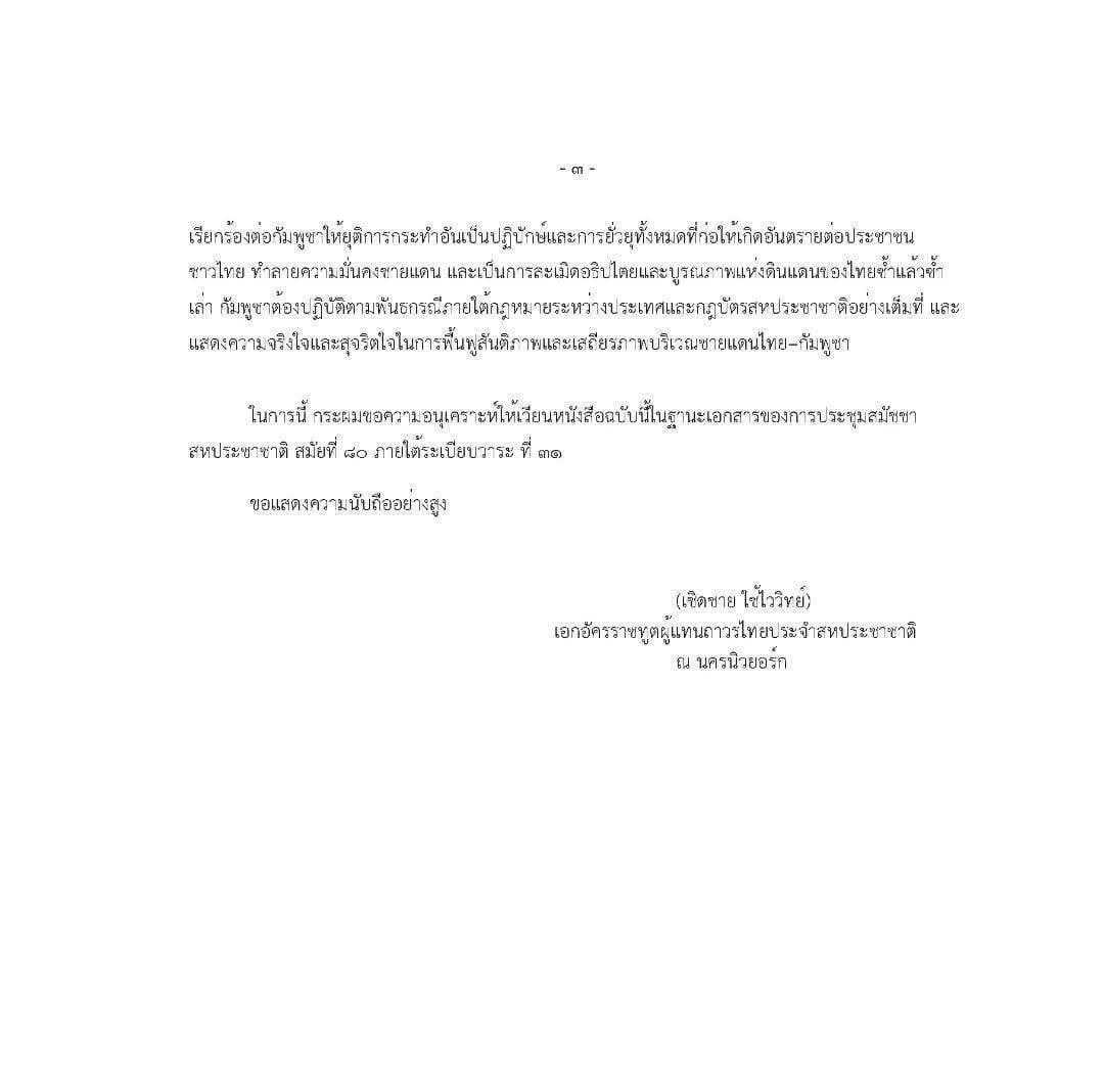 เปิดหนังสือทูตผู้แทนถาวรไทยประจำสหประชาชาติถึงเลขา UN แจงปมกัมพูชายิงก่อน ละเมิดข้อตกลงสันติภาพเรียกร้องประชาคมโลกกดดันกัมพูชาหยุดยิง