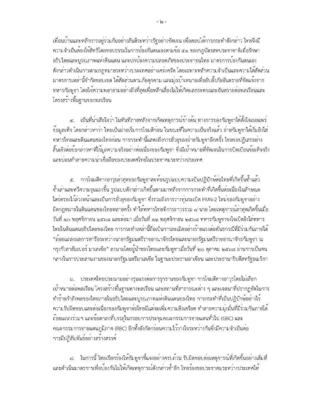 ๒. เมื่อวันที่ ๘ ธันวาคม ๒๕๖๘ เวลา ๐๕.๐๕ น. ทหารกัมพูชาได้เริ่มโจมตีฐานทหารไทยโดยปราศจากการยั่วยุใด ๆ ในพื้นที่ช่องอานม้า จังหวัดอุบลราชธานี ตามด้วยการโจมตีในวงกว้างอย่างไม่เลือกเป้าหมายตลอดหลายพื้นที่ภายในดินแดนของไทยในจังหวัดบุรีรัมย์ จังหวัดสุรินทร์ จังหวัดศรีสะเกษ และจังหวัดอุบลราชธานี