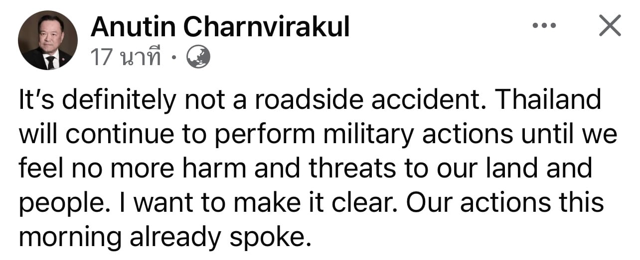 “ไม่ใช่อุบัติเหตุริมทาง ประเทศไทยจะยังคงดำเนินปฏิบัติการทางทหารต่อไป จนกว่าเราจะมั่นใจว่า จะไม่เหลืออันตรายและภัยคุกคามต่อแผ่นดินและประชาชนของเรา ผมขอทำให้ชัดเจน การกระทำของเราที่เกิดขึ้นในช่วงเช้าวันนี้ ได้แสดงคำตอบแล้ว”