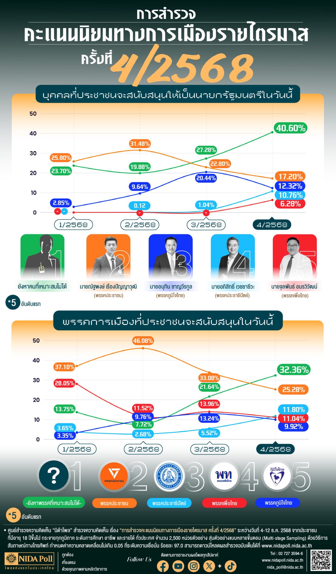 14 ธ.ค. 2568 – ศูนย์สำรวจความคิดเห็น “นิด้าโพล” สถาบันบัณฑิตพัฒนบริหารศาสตร์ (นิด้า) เปิดเผยผลการสำรวจ เรื่อง “การสำรวจคะแนนนิยมทางการเมืองรายไตรมาส ครั้งที่ 4/2568” ทำการสำรวจระหว่างวันที่ 4-12 ธันวาคม 2568 จากประชาชนที่มีอายุ 18 ปีขึ้นไป กระจายทุกภูมิภาค ระดับการศึกษา อาชีพ และรายได้ ทั่วประเทศ รวมจำนวนทั้งสิ้น 2,500 หน่วยตัวอย่าง เกี่ยวกับคะแนนนิยมทางการเมือง การสำรวจอาศัยการสุ่มตัวอย่างโดยใช้ความน่าจะเป็นจากบัญชีรายชื่อฐานข้อมูลตัวอย่างหลัก (Master Sample) ของ “นิด้าโพล” สุ่มตัวอย่างแบบหลายขั้นตอน (Multi-stage Sampling) เก็บข้อมูลด้วยวิธีการสัมภาษณ์ทางโทรศัพท์ โดยกำหนดค่าความคลาดเคลื่อนไม่เกิน 0.05 ที่ระดับความเชื่อมั่น ร้อยละ 97.0