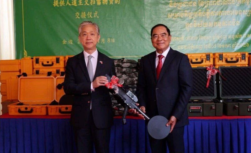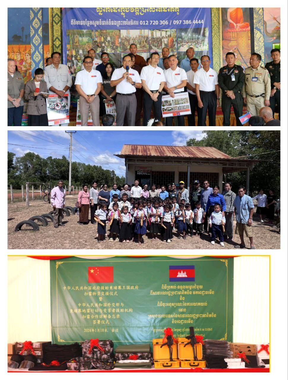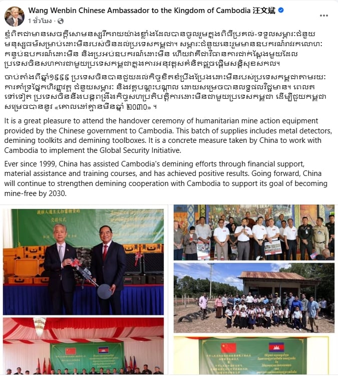 "หวัง เหวินปิน" ทูตจีนประจำกัมพูชา มอบอุปกรณ์เก็บกู้ทุ่นระเบิดที่รัฐบาลจีนช่วยเหลืองบประมาณ รวมมูลค่า 425,000 ดอลลาร์สหรัฐ ทั้งด้านวัสดุและหลักสูตรฝึกอบรมตามแผนร่วมมือความร่วมมือระดับโลก ประสบผลสำเร็จในเชิงบวก เพื่อช่วยให้กัมพูชาบรรลุเป้าหมายเป็นประเทศปลอดทุ่นระเบิดภายในปี 2030