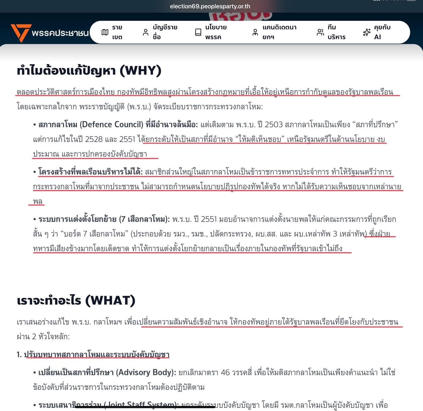 ภาพของพรรคประชาชนหรือพรรคส้มกับกองทัพ เกิดจากสิ่งที่พูดและสิ่งที่เขียนเดินไปทางเดียวกันมานานหลายปี คำพูดของแกนนำที่สังคมได้ยิน ไม่ได้หยุดอยู่บนเวทีปราศรัย แต่ไหลต่อเข้าไปอยู่ในเอกสารนโยบายอย่างเป็นทางการ ซึ่งพรรคเรียกมันว่า “นโยบายปฏิรูปกองทัพ” วิธีคิดต่อกองทัพจึงไม่ใช่อารมณ์ชั่ววูบ แต่เป็นกรอบความคิดที่ถูกย้ำซ้ำและจัดวางเป็นโครงสร้างภายใต้คำว่าการปฏิรูป
