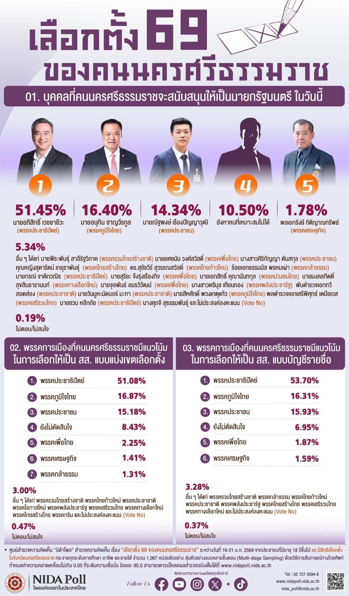 27 ม.ค.2569-ศูนย์สำรวจความคิดเห็น “นิด้าโพล” สถาบันบัณฑิตพัฒนบริหารศาสตร์ (นิด้า) เปิดเผยผลการสำรวจ เรื่อง “เลือกตั้ง 69 ของคนนครศรีธรรมราช” ทำการสำรวจระหว่างวันที่ 19 – 21 มกราคม 2569 จากประชาชนที่มีอายุ 18 ปีขึ้นไป และมีสิทธิเลือกตั้งในจังหวัดนครศรีธรรมราช กระจายทุกระดับการศึกษา อาชีพ และรายได้ รวมจำนวนทั้งสิ้น 1,067 หน่วยตัวอย่าง เกี่ยวกับการเลือกตั้ง ปี 69 ของคนจังหวัดนครศรีธรรมราช