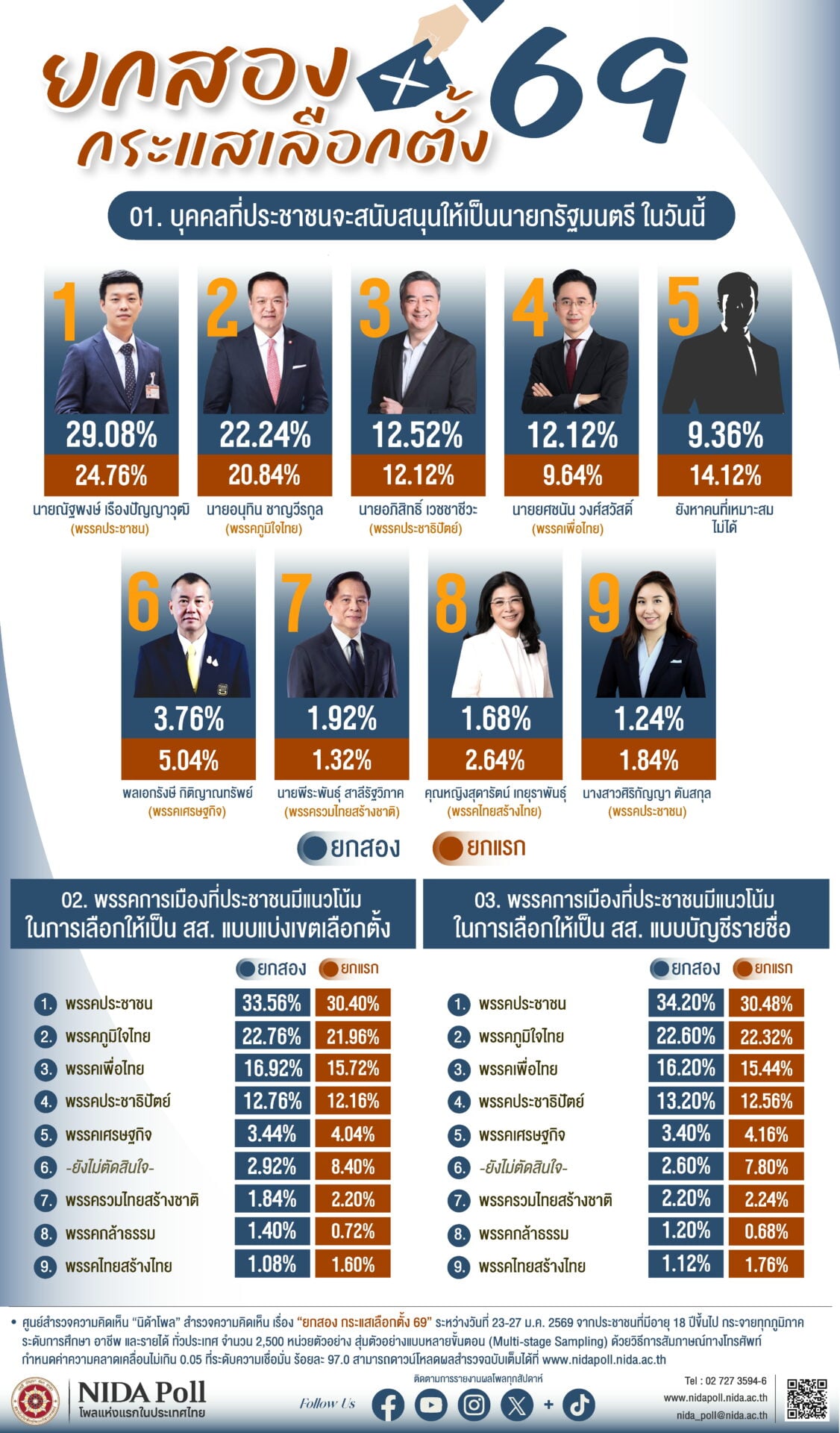 30 ม.ค. 2569 – ศูนย์สำรวจความคิดเห็น “นิด้าโพล” สถาบันบัณฑิตพัฒนบริหารศาสตร์ (นิด้า) เปิดเผยผลการสำรวจ เรื่อง “ยกสอง กระแสเลือกตั้ง 69” ทำการสำรวจระหว่างวันที่ 23-27 มกราคม 2569 จากประชาชนที่มีอายุ 18 ปีขึ้นไป กระจายทุกภูมิภาค ระดับการศึกษา อาชีพ และรายได้ ทั่วประเทศ รวมจำนวนทั้งสิ้น 2,500 หน่วยตัวอย่าง เกี่ยวกับกระแสการเลือกตั้ง ปี 2569 การสำรวจอาศัยการสุ่มตัวอย่างโดยใช้ความน่าจะเป็นจากบัญชีรายชื่อฐานข้อมูลตัวอย่างหลัก (Master Sample) ของ “นิด้าโพล” สุ่มตัวอย่างแบบหลายขั้นตอน (Multi-stage Sampling) เก็บข้อมูลด้วยวิธีการสัมภาษณ์ทางโทรศัพท์ โดยกำหนดค่าความคลาดเคลื่อนไม่เกิน 0.05 ที่ระดับความเชื่อมั่น ร้อยละ 97.0