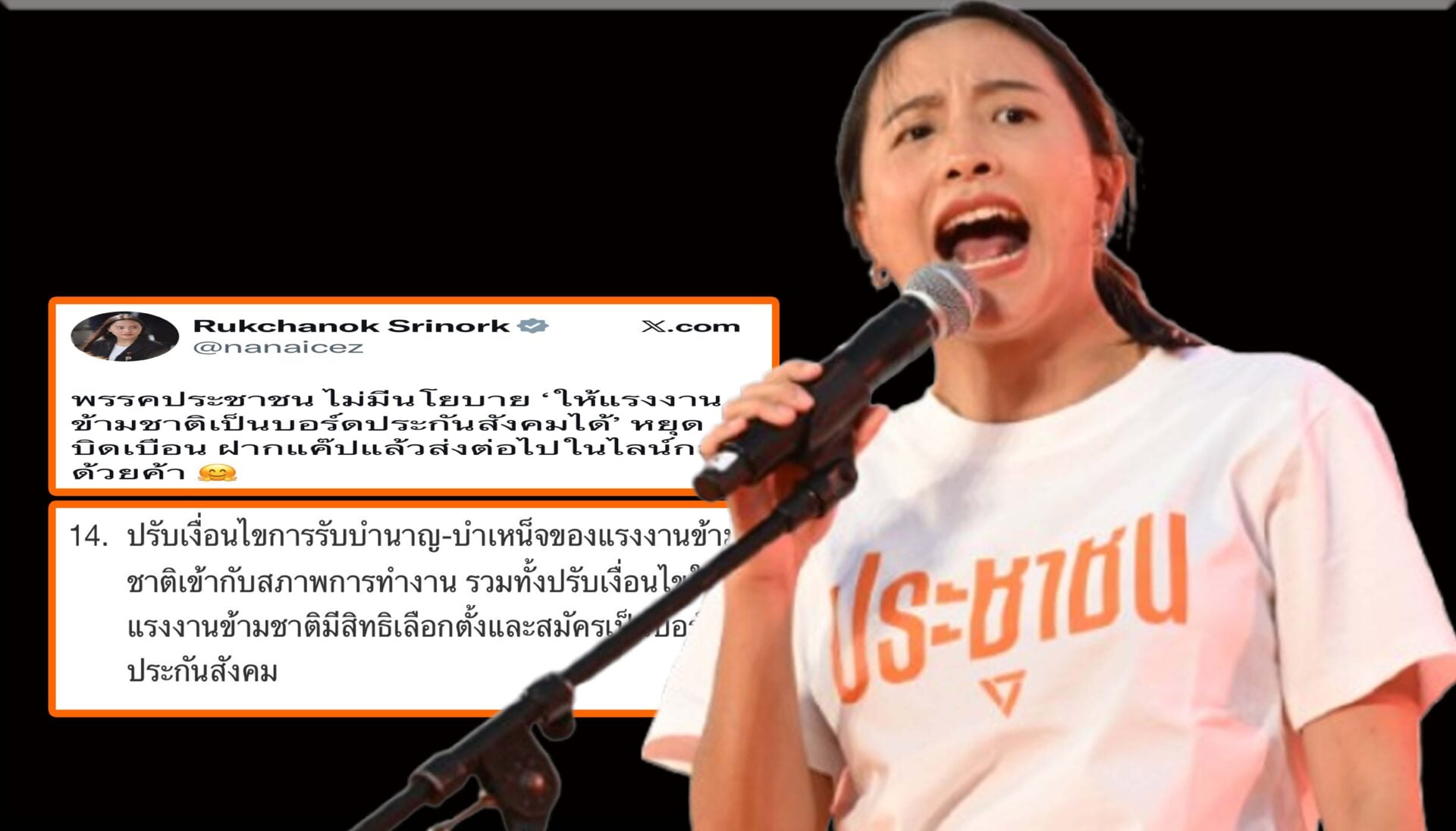 ในจังหวะนี้เอง ไอซ์ รักชนก ศรีนอก ออกมาโพสต์ข้อความบนแพลตฟอร์ม X ระบุว่า “ไม่มีนโยบาย ‘ให้แรงงานข้ามชาติเป็นบอร์ดประกันสังคมได้’ หยุดบิดเบือน ฝากแค๊ปแล้วส่งต่อไปในไลน์กลุ่มด้วยค้า”