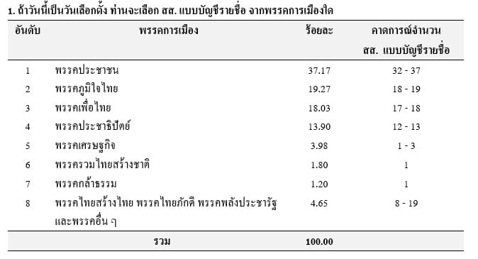 การสำรวจอาศัยการสุ่มตัวอย่างโดยใช้ความน่าจะเป็นจากบัญชีรายชื่อฐานข้อมูลตัวอย่างหลัก (Master Sample) ของ “นิด้าโพล” สุ่มตัวอย่างแบบหลายขั้นตอน (Multi-stage Sampling) โดยกำหนดค่าความคลาดเคลื่อนไม่เกิน 0.05 ที่ระดับความเชื่อมั่น ร้อยละ 97.0 และ 2) การวิเคราะห์สื่อ (Media Analysis) และการวิเคราะห์ความเป็นไปได้ทางการเมือง โดยใช้ผลการสำรวจ (โพล) ประกอบการวิเคราะห์ เพื่อคาดการณ์จำนวนสมาชิกสภาผู้แทนราษฎร (สส.) รวมแบบแบ่งเขตเลือกตั้งและแบบบัญชีรายชื่อของแต่ละพรรคการเมือง ผลการวิเคราะห์ค้นพบ ดังนี้