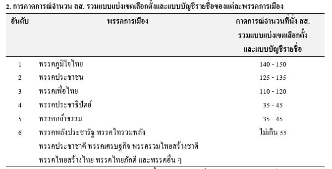 หมายเหตุ: การคาดการณ์จำนวน สส. รวมแบบแบ่งเขตเลือกตั้งและแบบบัญชีรายชื่อของแต่ละพรรคการเมืองใช้ฐานคำนวณจาก 1. การสำรวจความคิดเห็นของประชาชน จำนวน 3,000 หน่วยตัวอย่าง เกี่ยวกับการเลือก สส. ทั้งแบบแบ่งเขตเลือกตั้งและแบบบัญชีรายชื่อจากพรรคการเมือง 2. การสำรวจความคิดเห็นของประชาชน เรื่อง “ทำนายผลการเลือกตั้ง สส. กทม. 2569” 3. การวิเคราะห์สื่อ (Media Analysis) 4. การวิเคราะห์ความน่าจะเป็นทางการเมือง