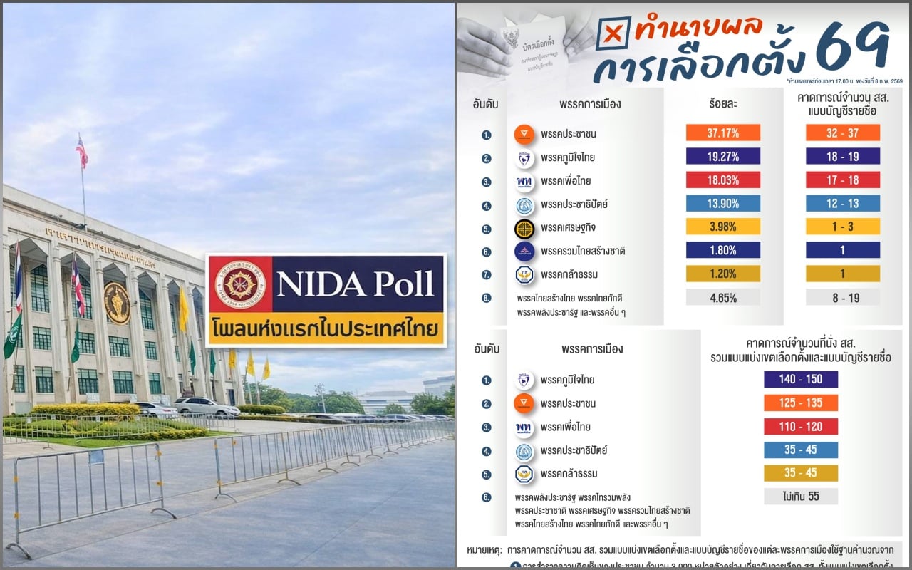 8 ก.พ.2569- ศูนย์สำรวจความคิดเห็น “นิด้าโพล” สถาบันบัณฑิตพัฒนบริหารศาสตร์ (นิด้า) คาดการณ์ผลการเลือกตั้งสมาชิกสภาผู้แทนราษฎร (สส.) 2569 ประกอบด้วยวิธีการ คือ 1) เก็บข้อมูลด้วยวิธีการสัมภาษณ์ทางโทรศัพท์โดยทำการสำรวจระหว่างวันที่ 31 มกราคม – 6 กุมภาพันธ์ 2569 จากประชาชนที่มีอายุ 18 ปีขึ้นไป และมีสิทธิเลือกตั้ง กระจายทุกภูมิภาค ระดับการศึกษา อาชีพ และรายได้ ทั่วประเทศ รวมจำนวนทั้งสิ้น 3,000 หน่วยตัวอย่าง