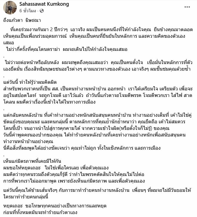 แต่วันนี้ ทำให้รู้ว่าผมคิดผิด สำหรับพวกเราคนที่เป็น สส. เป็นคนทำงานหน้าบ้าน ออกหน้า เราได้เตรียมใจ เตรียมตัว เพื่อจะอยู่ในสปอตไลท์ จะถูกโจมตีเอาไว้แล้ว ถ้าวันนี้แก้วตาจะโจมตีพรรค โจมตีพวกเรา ใส่ไฟ สาดโคลน ผมคืดว่าเรื่องนี้เข้าใจได้ในทางการเมือง
