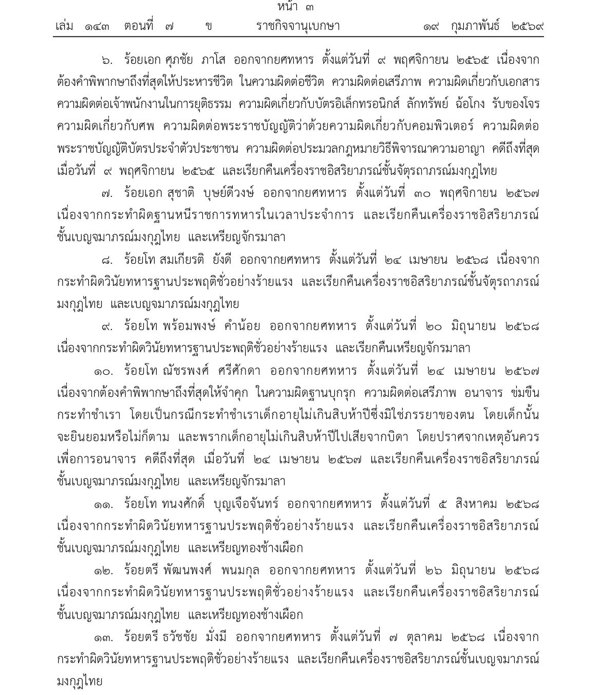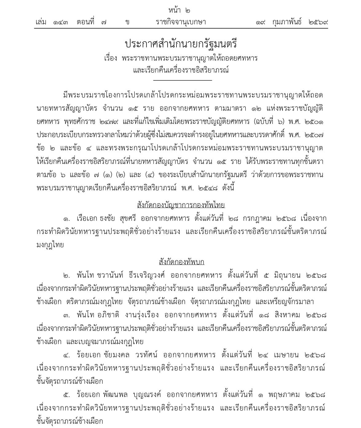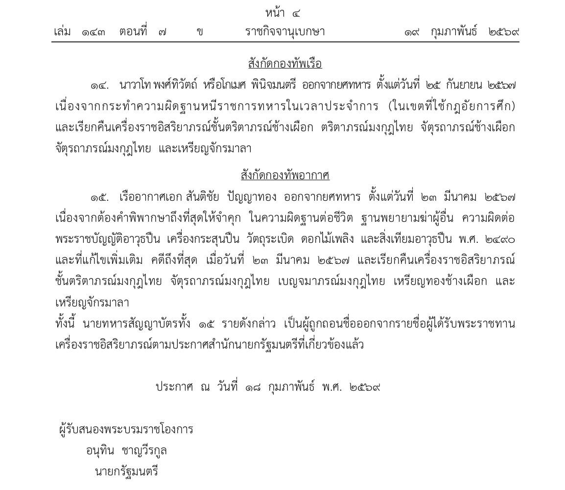 20 กุมภาพันธ์ 2569 - เว็บไซต์ราชกิจจานุเบกษา เผยแพร่ประกาศสำนักนายกรัฐมนตรีเรื่อง พระราชทานพระบรมราชานุญาตให้ถอดยศทหาร และเรียกคืนเครื่องราชอิสริยาภรณ์