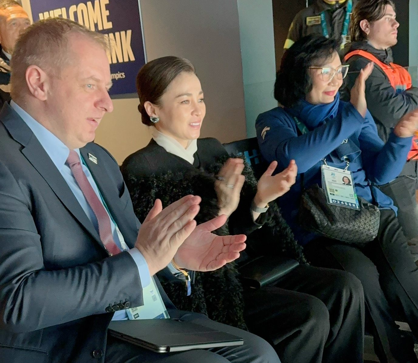 พระราชินีทอดพระเนตรแข่งขันฮอกกี้น้ำแข็งหญิงรอบชิงเหรียญทองที่เมืองมิลาน ฉลองพระองค์สง่างาม