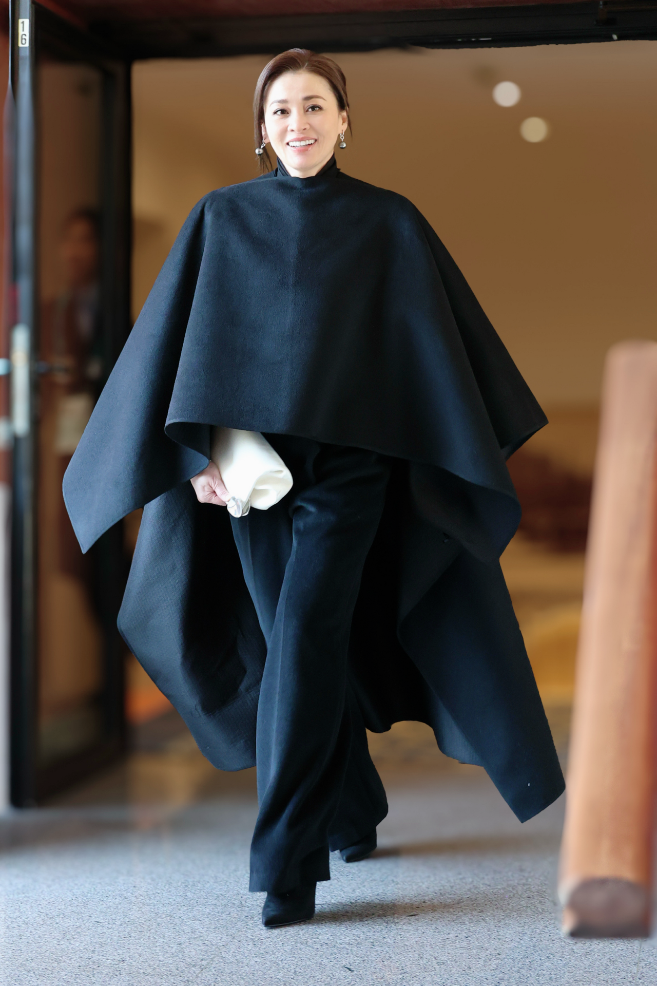 สำหรับฉลองพระองค์ในวันนี้เป็น “เสื้อทรง” แจ็กเก็ตตัวครอปแขนยาวสีดำ คอกลม ผ้าวูล พระดุมนิลทรงโค้ง ฐานเงินรมดำเรียงด้านหน้า ปลายแขนตกแต่งด้วยผ้าไหมสีขาว ใส่คู่กับพระสนับเพลาทรงตรงเอวสูงสีดำ สวมคลุมด้วยผ้าคลุมไหล่ยาว สีดำ ผ้าวูลผสมผ้าไหมทอยกลาย ทรงปล่อยชายแบบอสมมาตร พระกระเป๋าหนังสีดำ ฉลองพระบาทเรียบสีดำ พระกุณฑลไข่มุกตาฮิติสีเทา (Tahitian Pearls) ตัวเรือนเงินฝังเพชร และพระธำมรงค์ไข่มุกเซาท์ซีล้อมเพชร ตัวเรือนทองคำขาว โทนเทาตัดกับสีดำ