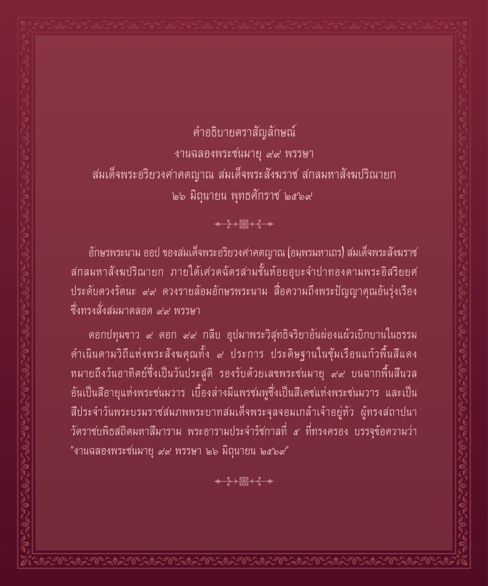 28 กุมภาพันธ์ 2569 - เพจเฟซบุ๊ก สำนักงานเลขานุการสมเด็จพระสังฆราช เผยแพร่ตราสัญลักษณ์งานฉลองพระชนมายุ 99 พรรษา สมเด็จพระอริยวงศาคตญาณ สมเด็จพระสังฆราช สกลมหาสังฆปริณายก 26 มิถุนายน พุทธศักราช 2569
