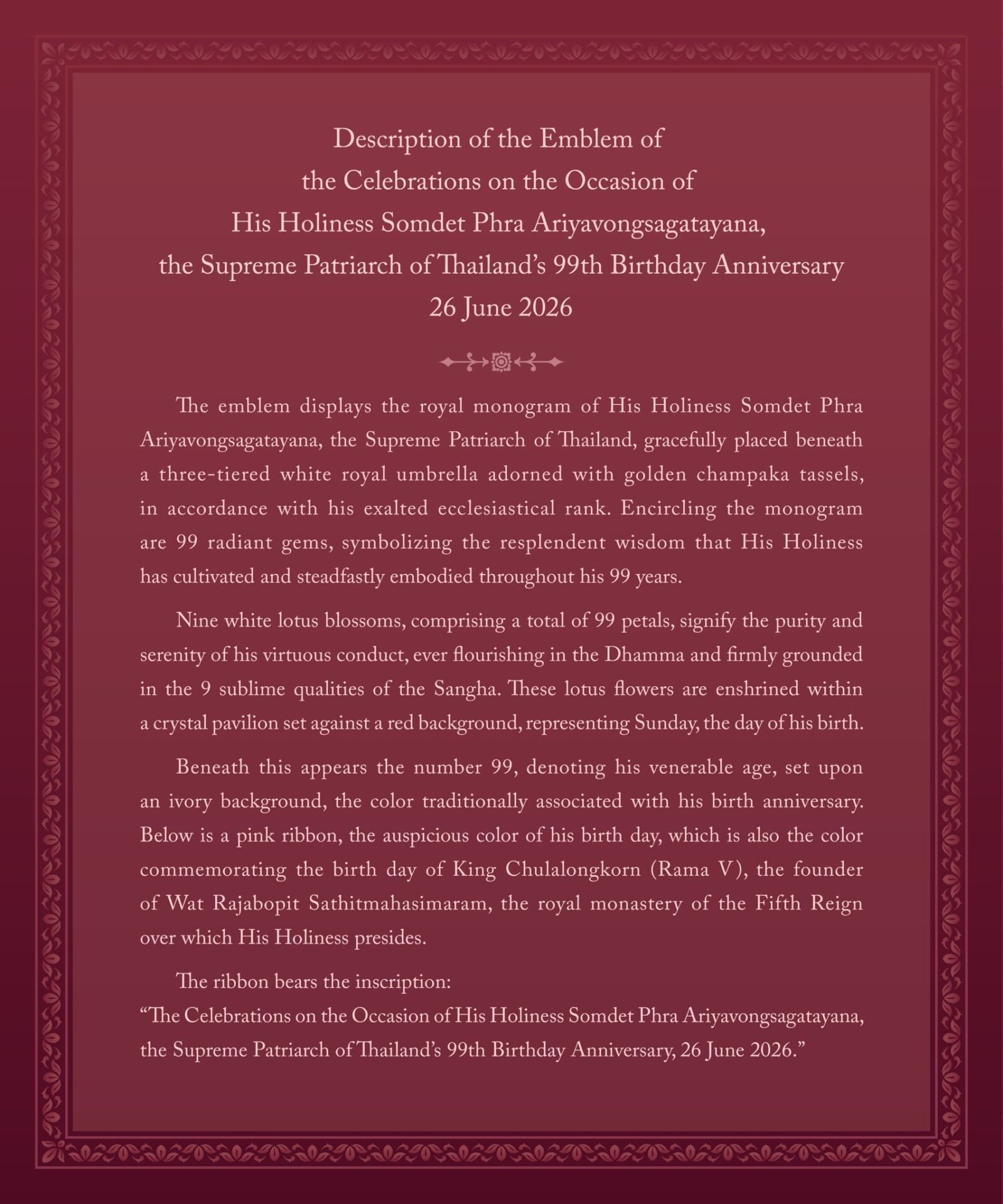 เบื้องล่างมีแพรชมพูซึ่งเป็นสีเดชแห่งพระชนมวาร และเป็นสีประจำวันพระบรมราชสมภพพระบาทสมเด็จพระจุลจอมเกล้าเจ้าอยู่หัว ผู้ทรงสถาปนาวัดราชบพิธสถิตมหาสีมาราม พระอารามประจำรัชกาลที่ 5 ที่ทรงครอง บรรจุข้อความว่า "งานฉลองพระชนมายุ 99 พรรษา 26 มิถุนายน 2569"