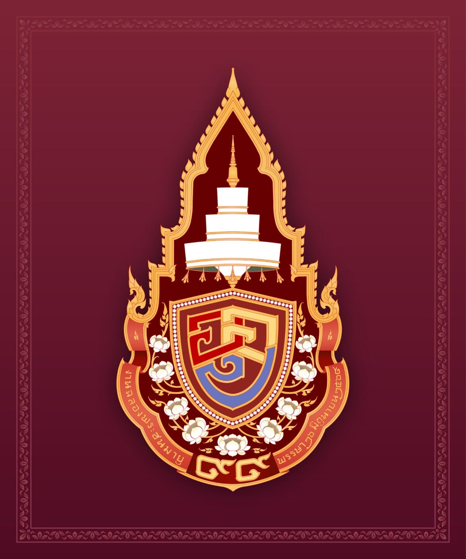 ดอกปทุมขาว 9 ดอก 99 กลีบ อุปมาพระวิสุทธิจริยาอันผ่องแผ้วเบิกบานในธรรม ดำเนินตามวิถีแห่งพระสังฆคุณทั้ง 9 ประการ ประดิษฐานในซุ้มเรือนแก้วพื้นสีแดง หมายถึงวันอาทิตย์ซึ่งเป็นวันประสูติ รองรับด้วยเลขพระชนมายุ 99 บนฉากพื้นสีนวลอันเป็นสีอายุแห่งพระชนมวาร