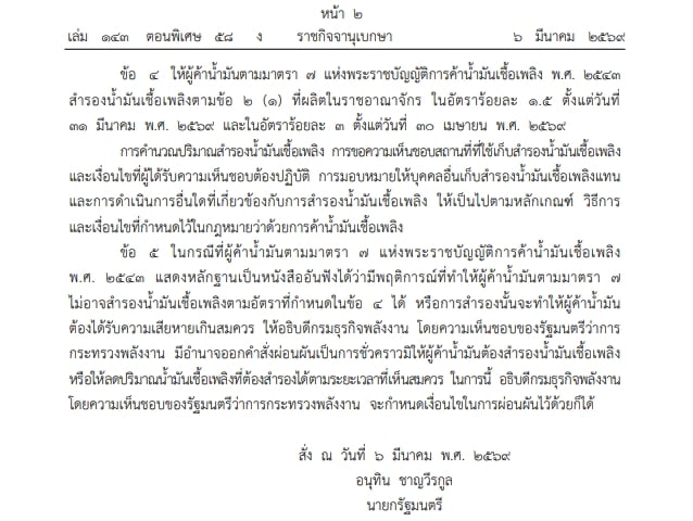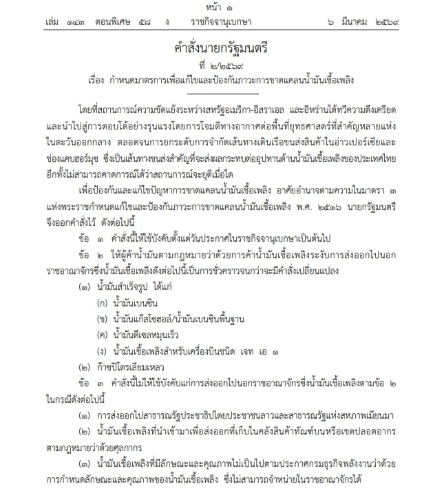 6 มีนาคม 2569 – เว็บไซต์ราชกิจจานุเบกษา เผยแพร่คำสั่งนายกรัฐมนตรี ที่ ๒/๒๕๖๙ เรื่อง กำหนดมาตรการเพื่อแก้ไขและป้องกันภาวะการขาดแคลนน้ำมันเชื้อเพลิง