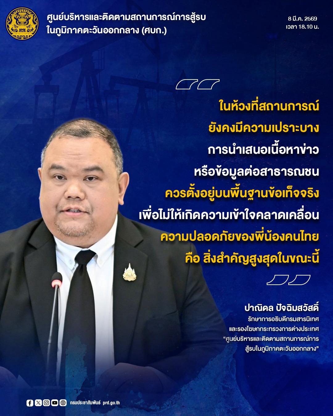 นายปาณิดล กล่าวว่า ขอย้ำว่าการแสดงความคิดเห็นและการแสดงออกของทุกภาคส่วนสามารถกระทำได้ แต่ในห้วงที่สถานการณ์ยังคงมีความเปราะบาง การนำเสนอเนื้อหาข่าว หรือข้อมูลต่อสาธารณชนควรตั้งอยู่บนพื้นฐานของข้อเท็จจริง และความรับผิดชอบต่อสังคม เพื่อไม่ให้เกิดความเข้าใจคลาดเคลื่อน โดยเฉพาะเมื่อยังมีคนไทยอยู่ในพื้นที่ ซึ่งความปลอดภัยของพี่น้องคนไทย คือสิ่งที่มีความสำคัญสูงที่สุดในขณะนี้.