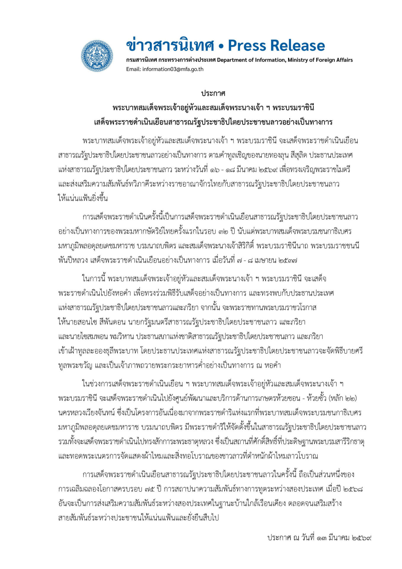 13 มี.ค. 2569 – กระทรวงการต่างประเทศ เผยแพร่ประกาศ พระบาทสมเด็จพระเจ้าอยู่หัวและสมเด็จพระนางเจ้าฯ พระบรมรมราชินี เสด็จพระราชดำเนินเยือนสาธารณรัฐประชาธิปไตยประชาชนลาวอย่างเป็นทางการ โดยมีใจความว่า