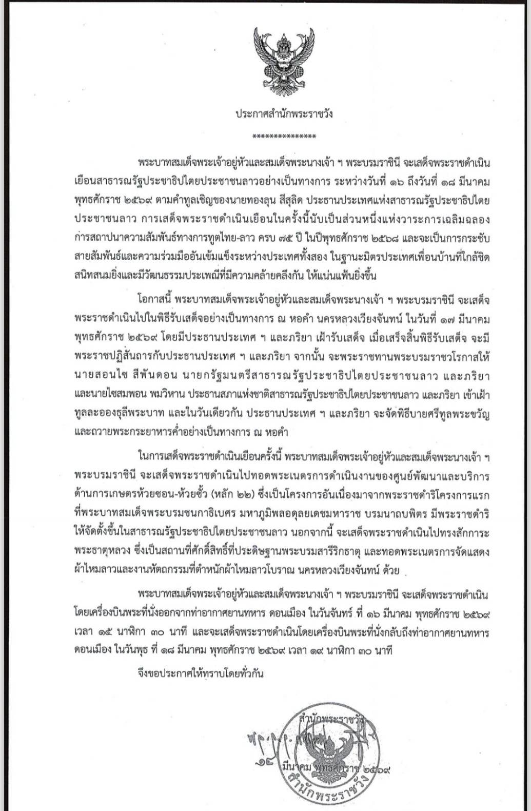 14 มีนาคม 2569 - สำนักพระราชวังออกประกาศพระบาทสมเด็จพระเจ้าอยู่หัวและสมเด็จพระนางเจ้า ฯ พระบรมราชินี จะเสด็จพระราชดำเนิน เยือนสาธารณรัฐประชาธิปไตยประชาชนลาวอย่างเป็นทางการ ระหว่างวันที่ 16 ถึงวันที่ 18 มีนาคม พุทธศักราช 2669 ตามคำทูลเชิญของนายทองลุน สีสุลิด ประธานประเทศแห่งสาธารณรัฐประชาธิปไตยประชาชนลาว การเสด็จพระราชดำเนินเยือนในครั้งนี้นับเป็นส่วนหนึ่งแห่งวาระการเฉลิมฉลองการสถาปนาความสัมพันธ์ทางการทูตไทย-ลาว ครบ 75 ปี ในปีพุทธศักราช 2568 และจะเป็นการกระชับสายสัมพันธ์และความร่วมมืออันเข้มแข็งระหว่างประเทศทั้งสอง ในฐานะมิตรประเทศเพื่อนบ้านที่ใกล้ชิดสนิทสนมยิ่งและมีวัฒนธรรมประเพณีที่มีความคล้ายคลึงกัน ให้แน่นแฟ้นยิ่งขึ้น