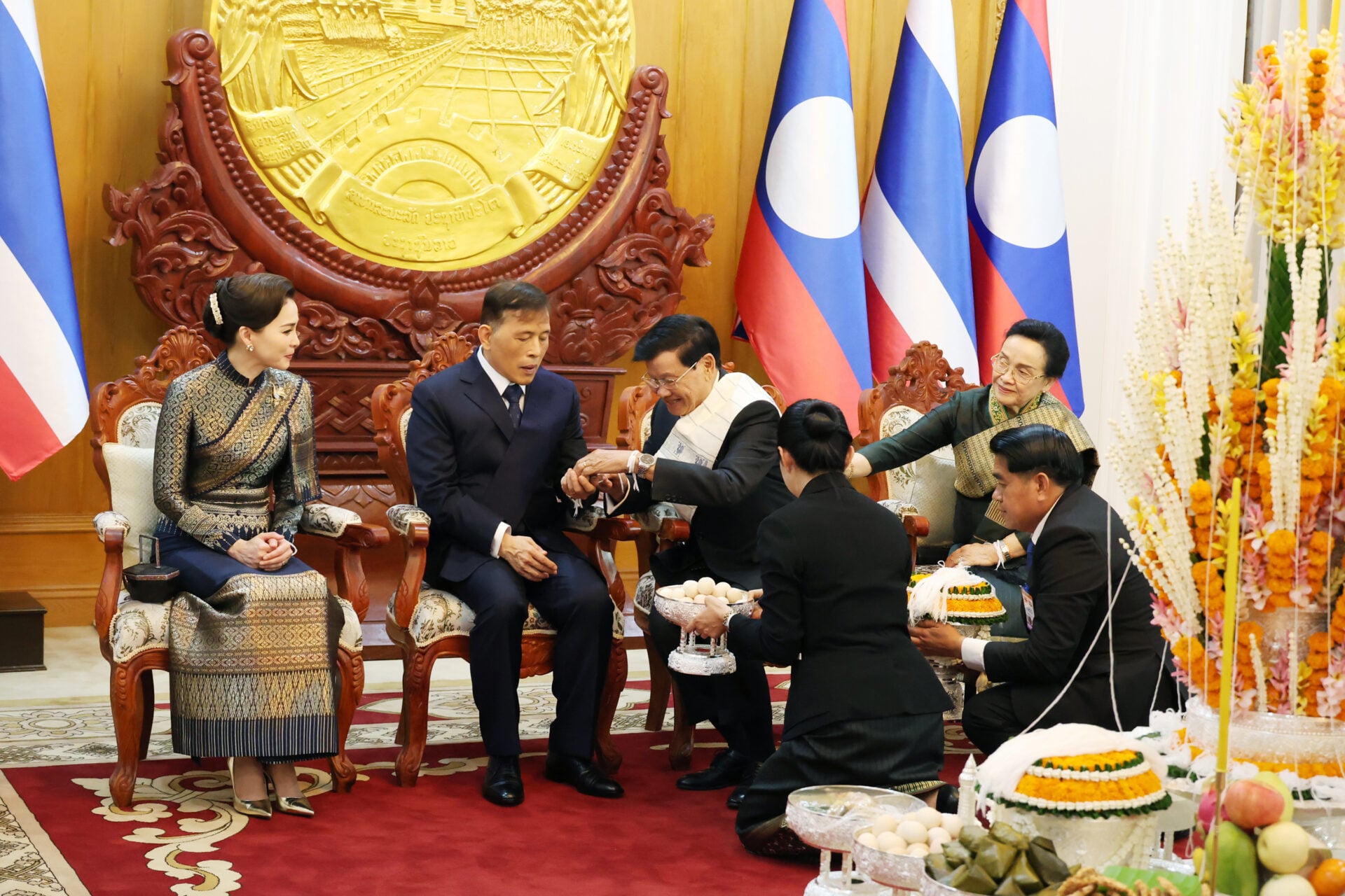จากนั้น พระบาทสมเด็จพระเจ้าอยู่หัว เสด็จพระราชดำเนินไปยังด้านหน้าพุ่มบายศรี พร้อมด้วยประธานประเทศ ทรงจุดเทียนที่ยอดพุ่มบายศรี แล้วประทับพระราชอาสน์ เจ้าหน้าที่พิธีการฝ่ายลาว ทูลเกล้าทูลกระหม่อมถวายสายสิญจน์ แด่พระบาทสมเด็จพระเจ้าอยู่หัว และสมเด็จพระนางเจ้า ฯ พระบรมราชินี ทรงประนมพระกรและทรงถือสายสิญจน์ระหว่างประกอบพิธี เมื่อเสร็จพิธีแล้ว ทรงส่งสายสิญจน์คืน จากนั้น พระราชทานพระบรมราชวโรกาสให้ หมอพร เฝ้าทูลละอองธุลีพระบาท ทูลเกล้าทูลกระหม่อมถวายไข่ขวัญ และขอพระราชทานพระบรมราชานุญาตผูกสายสิญจน์ที่ข้อพระหัตถ์ซ้ายพระบาทสมเด็จพระเจ้าอยู่หัว และผูกสายสิญจน์ที่ข้อพระหัตถ์ซ้ายสมเด็จพระนางเจ้า ฯ พระบรมราชินี