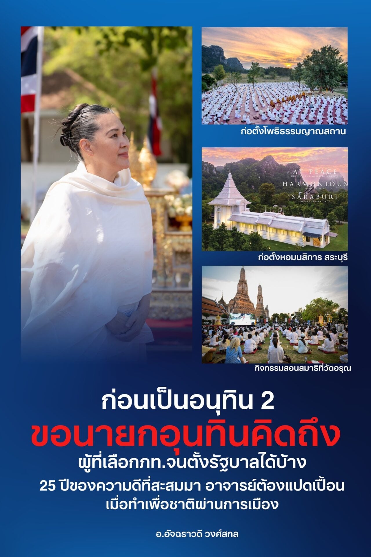 29 มี.ค.2569-อ.อัจฉราวดี วงศ์สกล วิปัสสนาจารย์ชื่อดัง และประธานมูลนิธิโรงเรียนแห่งชีวิต และมูลนิธิโนอิ้ง บุดด้า โพสต์เฟซบุ๊ก”จดหมายเปิดผนึกถึงนายกอนุทิน” เนื้อหาระบุว่า อาจารย์เขียนจดหมายนี้ แทนความรู้สึกของคนมากมายที่ยอมตัดสินใจเลือกภท. จนไม่อีกวันข้างหน้าประเทศจะได้รัฐบาลที่มีฝั่งสีน้ำเงินอันเป็นสัญลักษณ์ของเทิดทูนสถาบันกษัตริย์ เป็นครั้งแรก