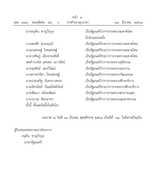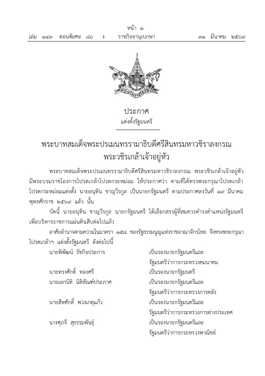 ราชกิจจานุเบกษาเผยแพร่ ประกาศ แต่งตั้งรัฐมนตรี พระบาทสมเด็จพระปรเมนทรรามาธิบดีศรีสินทรมหาวชิราลงกรณพระวชิรเกล้าเจ้าอยู่หัว มีพระบรมราชโองการโปรดเกล้าโปรดกระหม่อม ให้ประกาศว่า ตามที่ได้ทรงพระกรณาโปรดเกล้า โปรดกระหม่อมแต่งตั้ง นายอนุทิน ชาญวีรกูล เป็นนายกรัฐมนตรี ตามประกาศลงวันที่ ๑๙ มีนาคมพุทธศักราช ๒๕๖๙ แล้ว นั้น