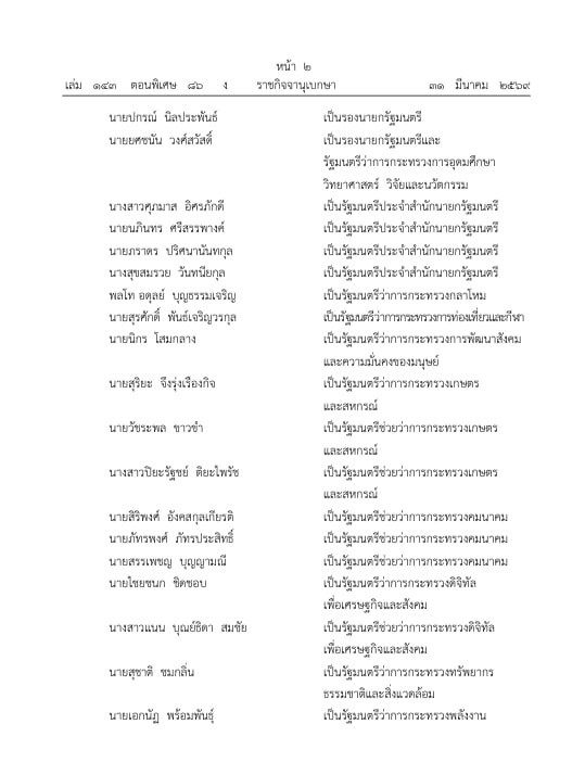 14.นายนิกร โสมกลาง รัฐมนตรีว่าการกระทรวงการพัฒนาสังคมและความมั่นคงของมนุษย์ 15.นายสุริยะ จึงรุ่งเรืองกิจ รัฐมนตรีว่าการกระทรวงเกษตรและสหกรณ์ 16.นายวัชรพล ขาวขำ รัฐมนตรีช่วยว่าการกระทรวงเกษตรและสหกรณ์ 17. น.ส.ปิยะรัฐชย์ ติยะไพรัช รัฐมนตรีช่วยว่าการกระทรวงเกษตรและสหกรณ์ 18.นายสิริพงศ์ อังคสกุลเกียรติ รัฐมนตรีช่วยว่าการกระทรวงคมนาคม 19.นายภัทรพงศ์ ภัทรประสิทธิ์ รัฐมนตรีช่วยว่าการกระทรวงคมนาคม 20.นายสรรเพชญ บุญญามณี รัฐมนตรีช่วยว่าการกระทรวงคมนาคม 21.นายไชยชนก ชิดชอบ รัฐมนตรีว่าการกระทรวงดิจิทัลเพื่อเศรษฐกิจและสังคม