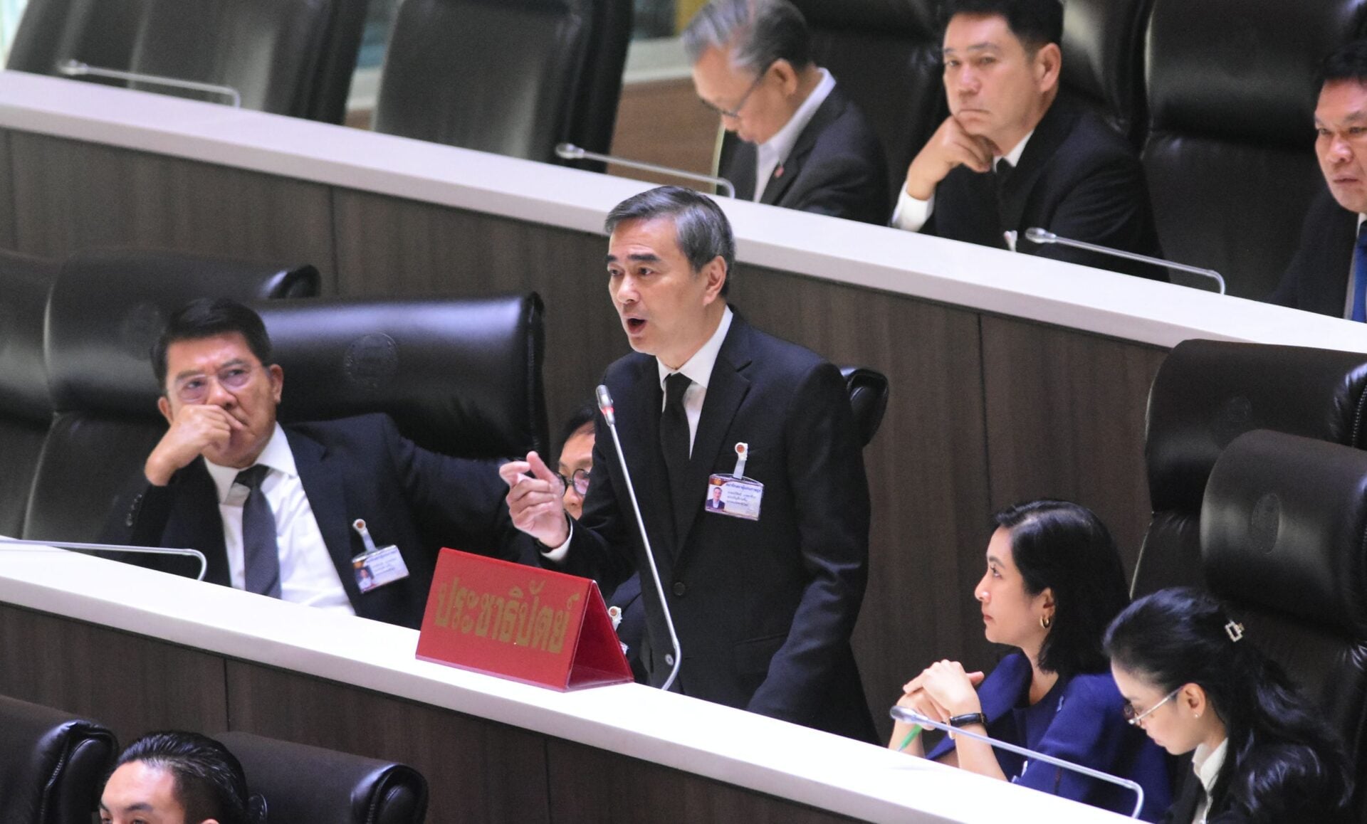 “ผมยังแปลกใจว่า ก่อนหน้าจะได้รายชื่อ ครม. ชุดปัจจุบัน มีการพูดถึงบุคคลท่านหนึ่งทำนองว่า เขาไม่ผ่านคุณสมบัติ ที่จริงสถานะเขาคือถูกกล่าวโดยกรมสอบสวนคดีพิเศษ (DSI) ถ้าใช้มาตรฐานเดียวกัน บนนั้นหลายคนครับ รวมทั้งท่านนายกฯ ด้วย นั่งบนนั้นไม่ได้” นายอภิสิทธิ์ กล่าว