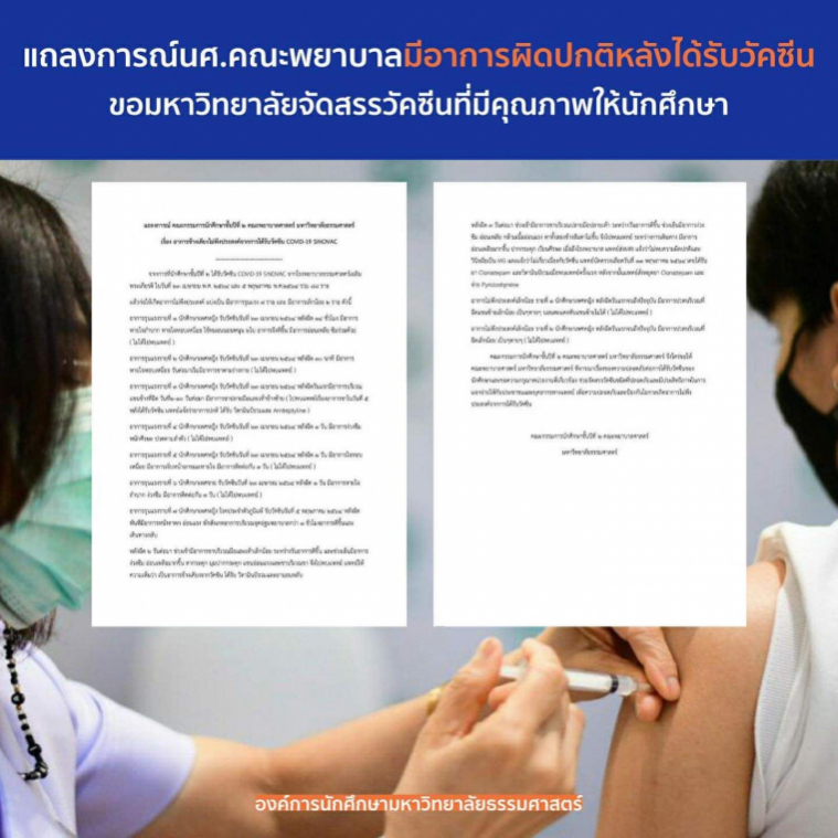 เมื่อช่วงเช้าของวันที่ 9 พ.ค. เพจ"องค์การนักศึกษามหาวิทยาลัยธรรมศาสตร์" ได้โพสต์ "แถลงการณ์ คณะกรรมการนักศึกษาชั้นปีที่ 2 คณะพยาบาลศาสตร์ มหาวิทยาลัยธรรมศาสตร์ เรื่องอาการข้างเคียง ไม่พึงประสงค์จากการได้รับวัคซีน COVID-19 SINOVAC จากการที่นักศึกษาชั้นปีที่ 2 ได้รับวัคชีน COVID-19 SINOVAC จากโรงพยาบาลธรรมศาสตร์เฉลิมพระเกียรติ ในวันที่ 23 เมษายน พ.ศ. 2564 และ 5 พฤษภาคม พ.ศ. 2564 รวม 88 รายแล้ว
