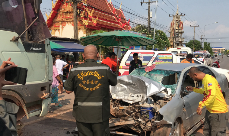 เก๋งวิ่งอยู่ในตัวเมืองหนองคาย จู่ๆ แหกเลนพุ่งประสานงาสิบล้อบรรทุกดิน คนขับรถเก๋งสาหัส ส่วนเพื่อนที่นั่งมาด้วยเสียชีวิต 2 ศพ
