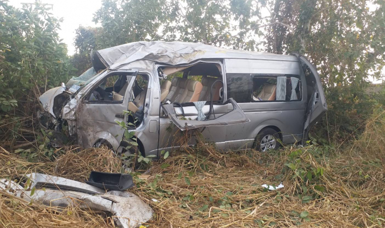รถตู้รับนักศึกษาวิทยาลัยเทคโนโลยีจะกลับวิทยาลัย คนขับซิ่งเพลินแหกโค้งพลิกหลายตลบ รถพังยับ นศ.สาวเสียชีวิตคาที่ บาดเจ็บระนาว 11 คน