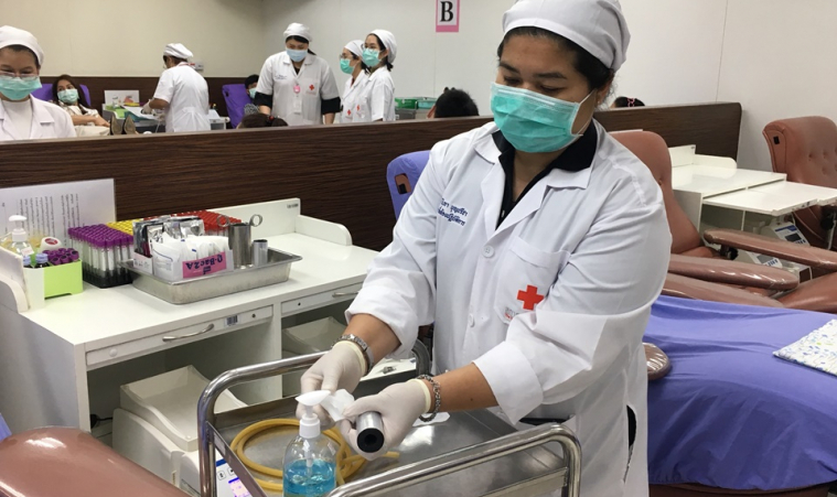 1.ตรวจวัดอุณหภูมิร่างกาย ผู้ประสงค์บริจาคโลหิตและบุคคลภายนอกที่เข้ามาภายในอาคาร รวมทั้งเจ้าหน้าที่ผู้ปฏิบัติงาน หากตรวจอุณหภูมิครั้งแรกเกิน 37.5 องศาเซลเซียส ให้นั่งพักรอบริเวณสถานที่จัดไว้ประมาณ 10 นาที และจะวัดอุณหภูมิครั้งที่ 2 หากผ่านเกณฑ์ให้เข้าสู่ภายในอาคาร หากไม่ผ่านจะมีเอกสารคำแนะนำให้ไปพบแพทย์เพื่อตรวจวินิจฉัยโรคต่อไป 2.ติดตั้งแอลกอฮอลล์เจลทั่วอาคาร 3.ทำความสะอาดวัสดุอุปกรณ์ด้วยน้ำยาฆ่าเชื้อ 70% แอลกอฮอล์ ซึ่งสามารถทำลายเชื้อไวรัสได้ 4.ทำความสะอาดพื้นห้องรับบริจาคโลหิต ห้องปฏิบัติการ ห้องผลิต ด้วยน้ำยาฆ่าเชื้อ 0.05% โซเดียม ไฮโปคลอไรด์ 5.ทำความสะอาดบริเวณปฏิบัติงาน โต๊ะ เก้าอี้ ปุ่มกดลิฟต์ และจุดสัมผัสร่วมต่างๆ ด้วยน้ำยาฆ่าเชื้อ 70% แอลกอฮอล์ 6.การสวมใส่อุปกรณ์ป้องกันส่วนบุคคลทุกครั้งที่ปฏิบัติงานด้านการรับบริจาคโลหิต